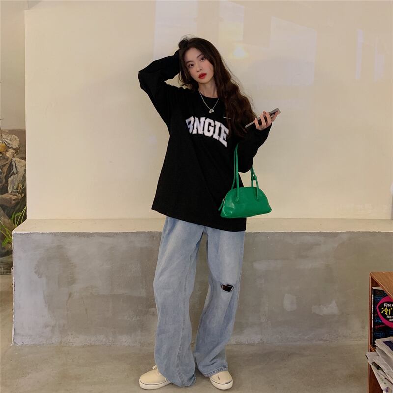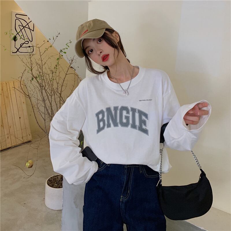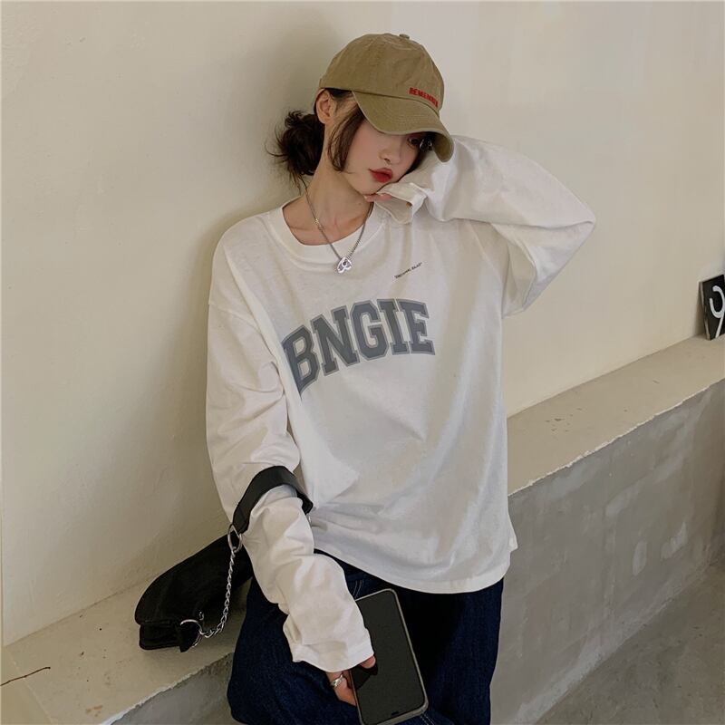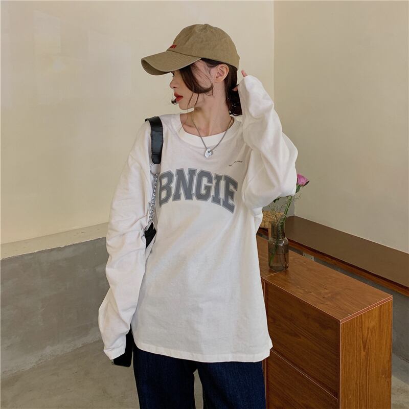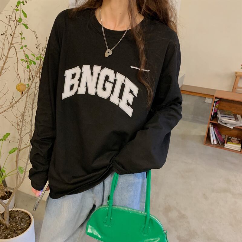 原宿レタープリント Tシャツ全試合特大 tシャツ女性フルスリーブ O ネック白黒トップス女性服 ホワイト ブラック かわいい Oネック Aim96966191216