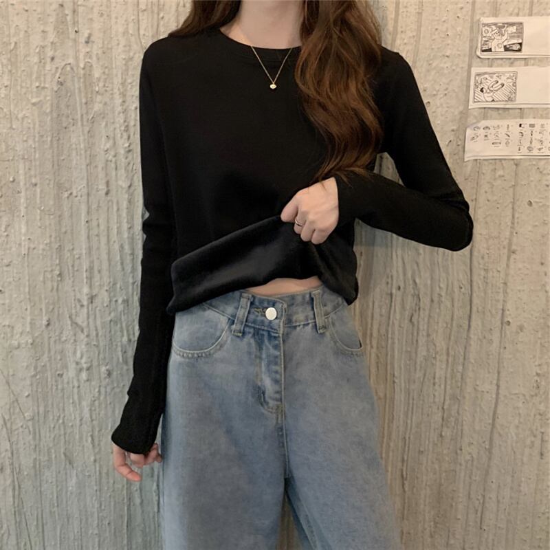 冬の服の女性暖かいフリース Tシャツファッションスリム O ネック厚いベルベット固体女性 tシャツ長袖底入れ Tシャツ y2k トップ ロング ウィンター 冬物 Oネック ソリッドカラー Aim72557619682