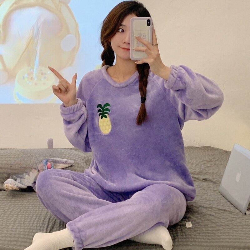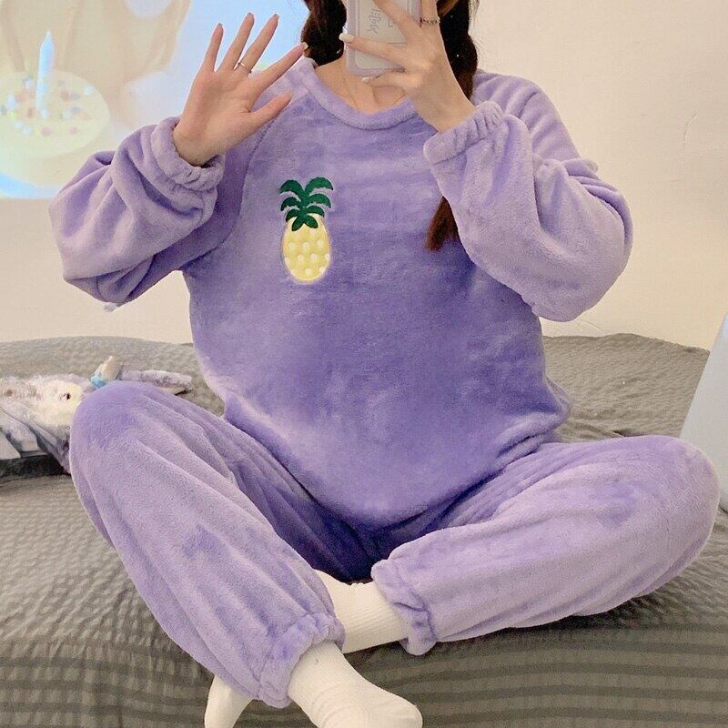 秋冬パイナップル印刷紫ホーム服スパースター韓国暖かいフランネルパジャマセット女性長袖パジャマスーツ ロング オータム 秋物 ウィンター 冬物 パープル Aim37660457092