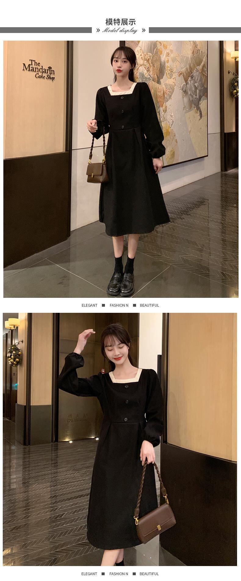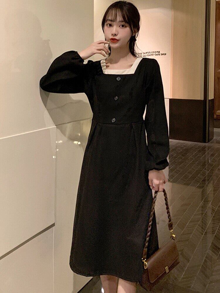 ミッドカーフデイリードレスヴィンテージコーデュロイロングスリーブドレス女性ソリッドスクエアカラーレディードレス 長袖 ソリッドカラー スクウェア ビンテージ Aim77197944136