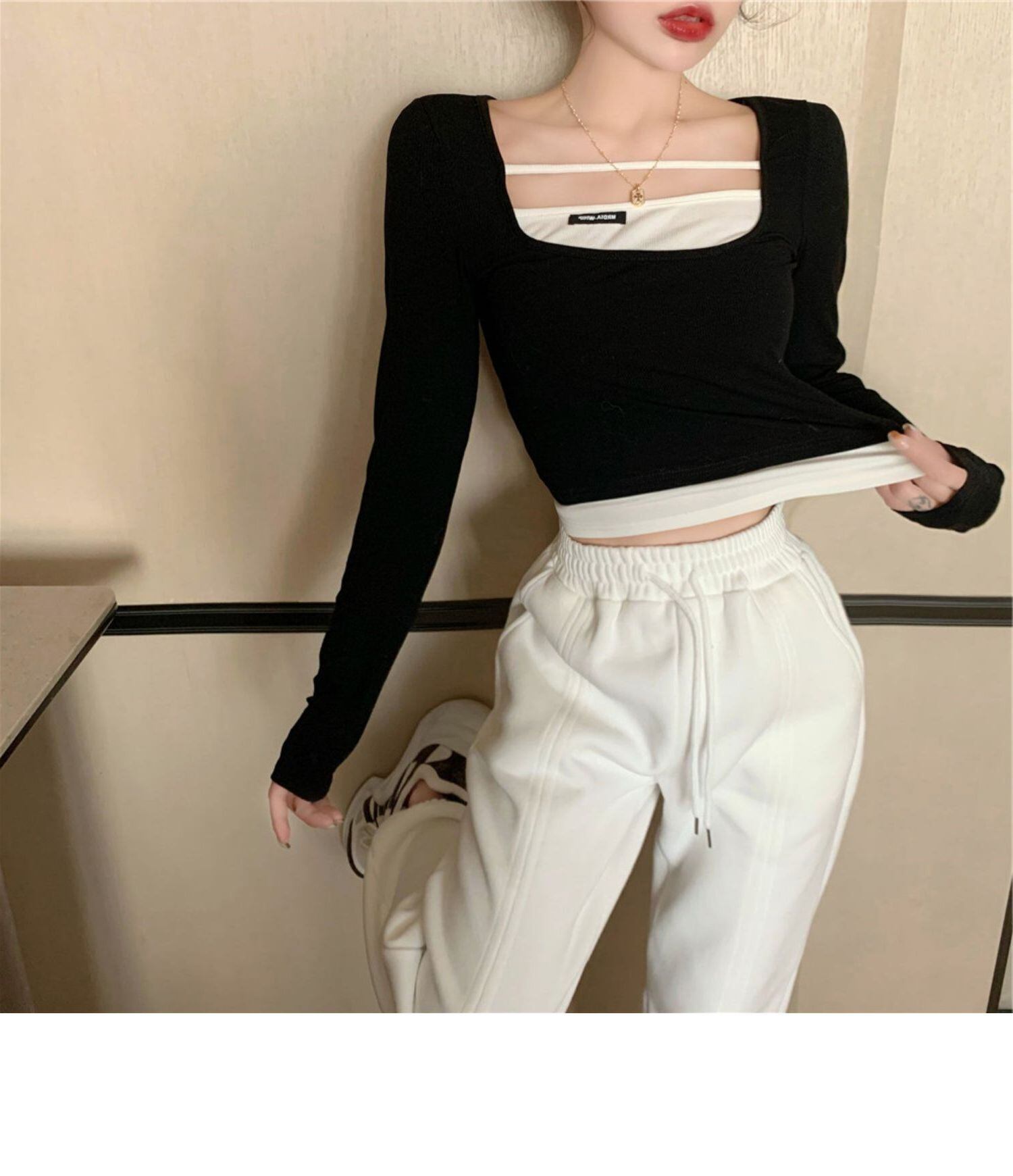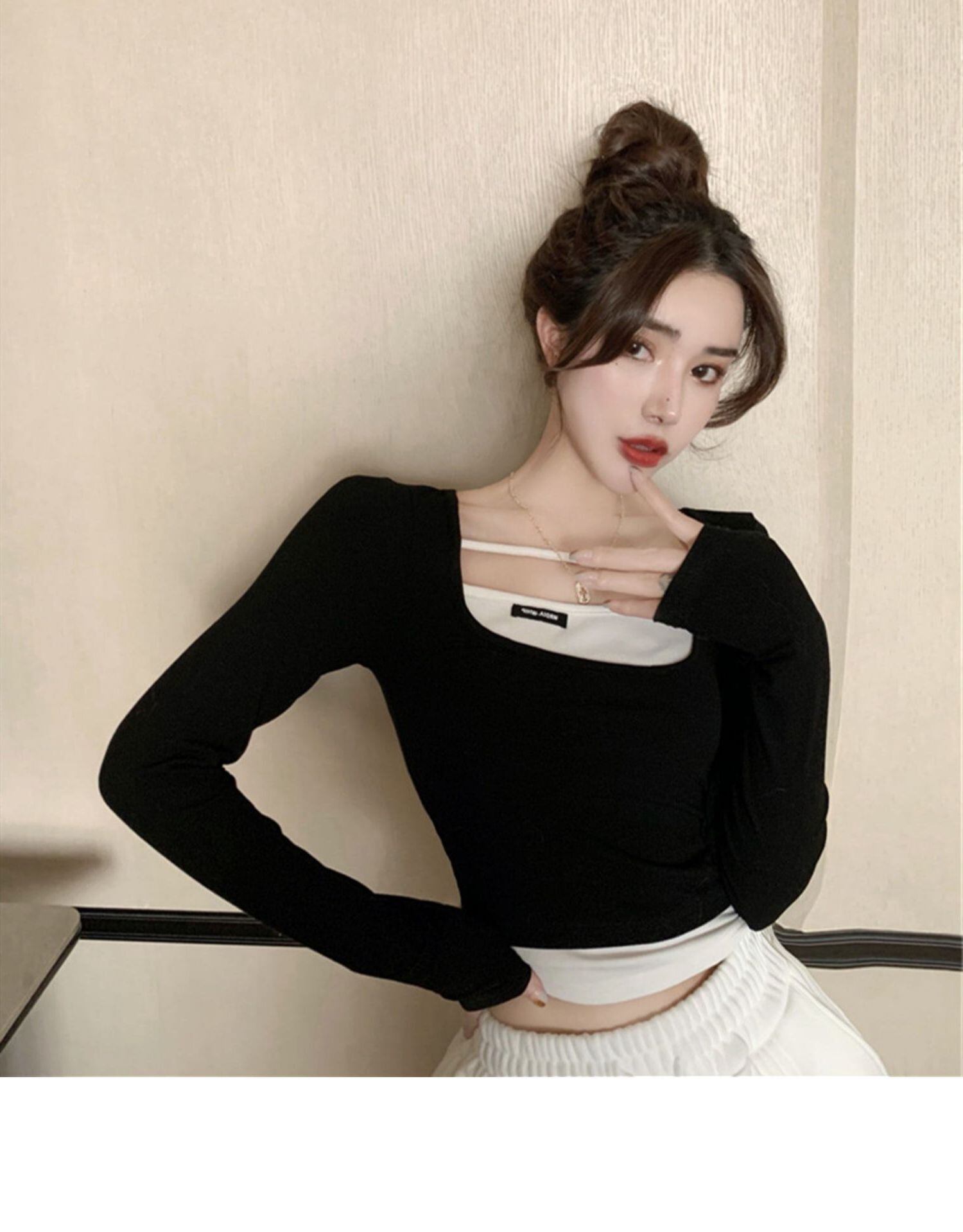 秋長袖セクシーなクロップトップ女性パッチワーク偽 2 Tシャツ服固体スリム底入れ Tシャツ白黒トップス ロング ホワイト ブラック オータム 秋物 ソリッドカラー Aim16314778364