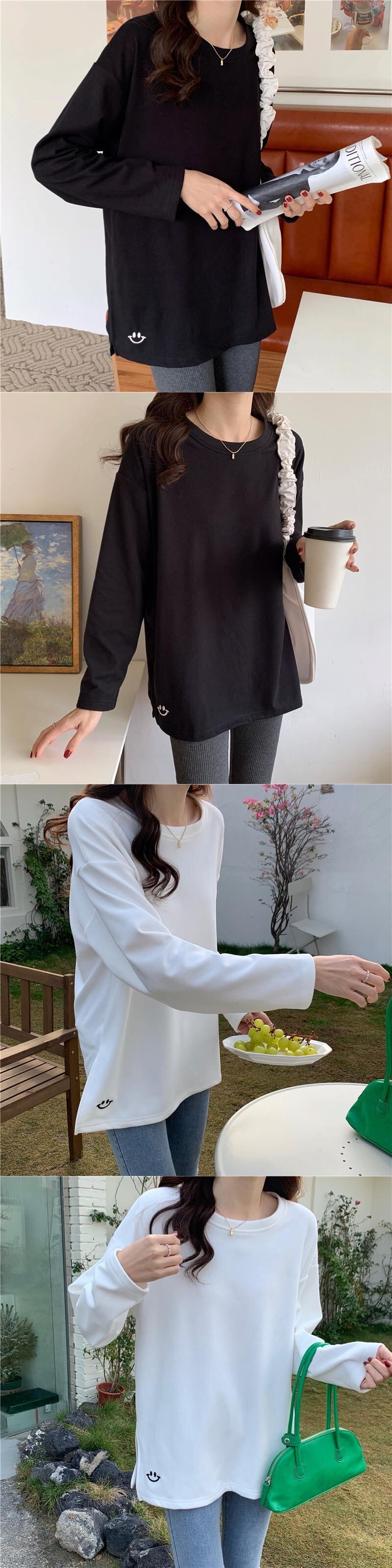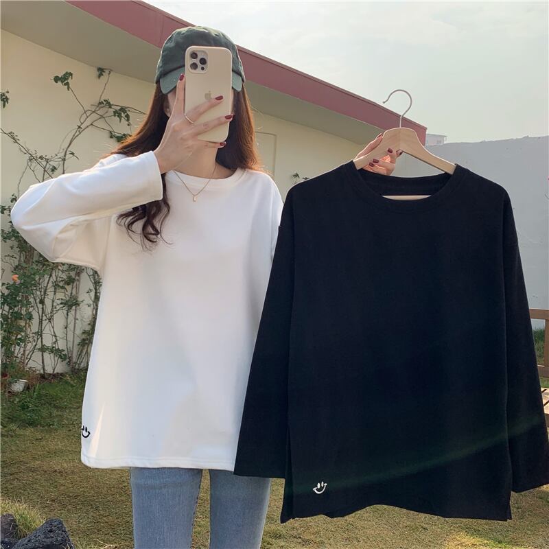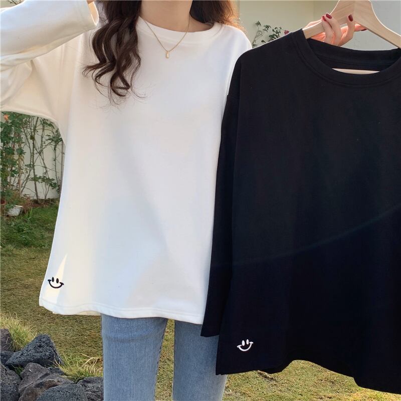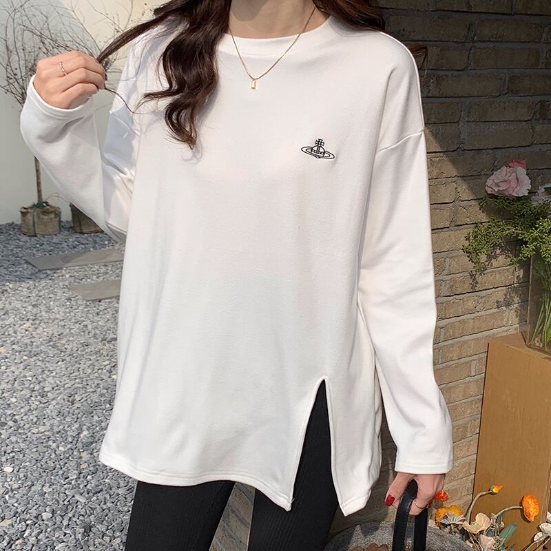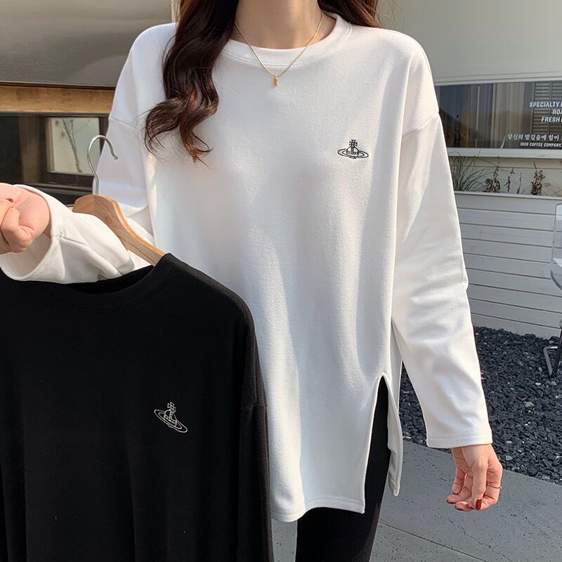 原宿特大厚く暖かいサイドスプリット底入れ Tシャツ女性秋冬ベルベット長袖刺繍 Tシャツトップス ロング かわいい オータム 秋物 ウィンター 冬物 Aim56134740947