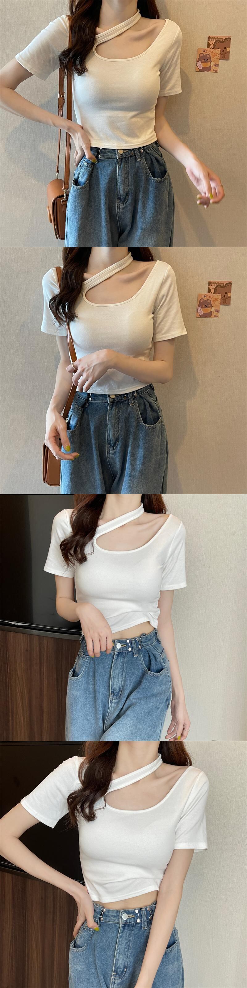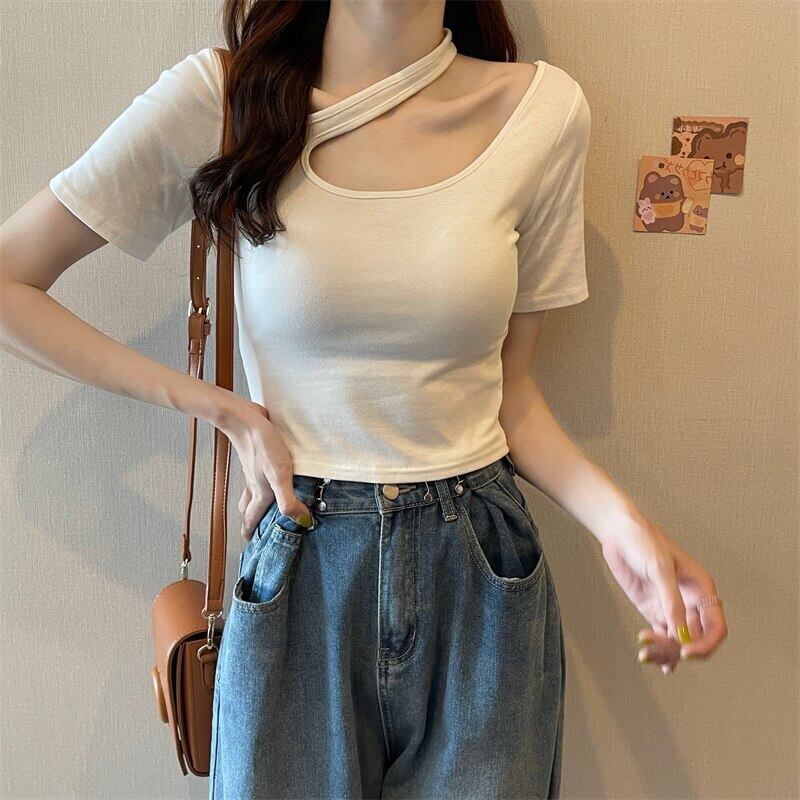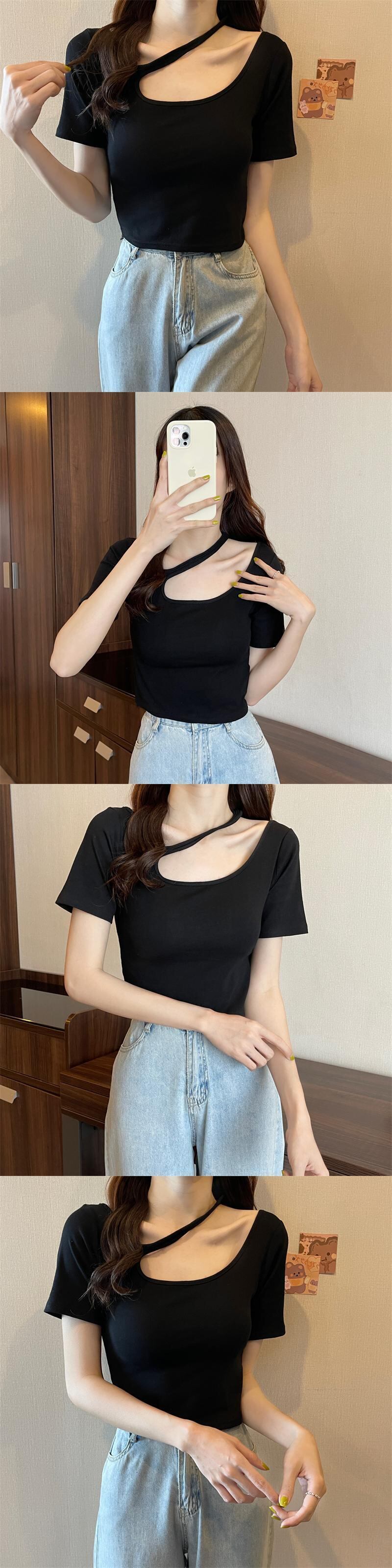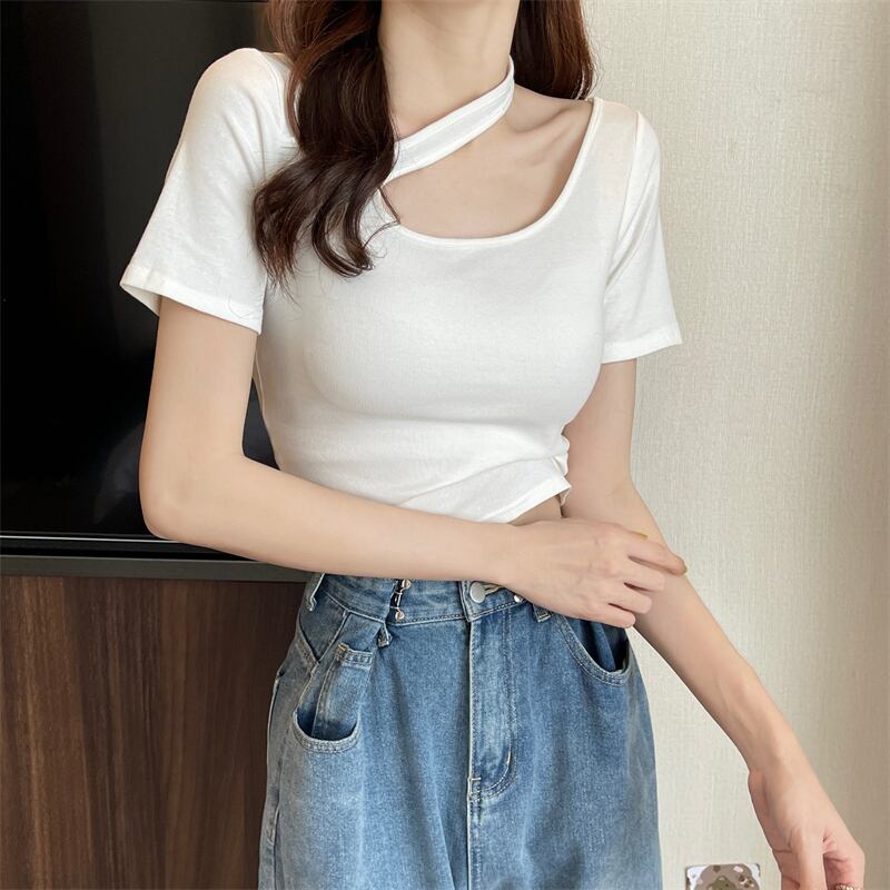 純粋な綿クロップトップ夏ソリッド Tシャツ女性半袖セクシーな中空アウト Tシャツ原宿若いスリムショートトップス コットン ハーフスリーブ かわいい サマー 夏物 ソリッドカラー Aim22380932801