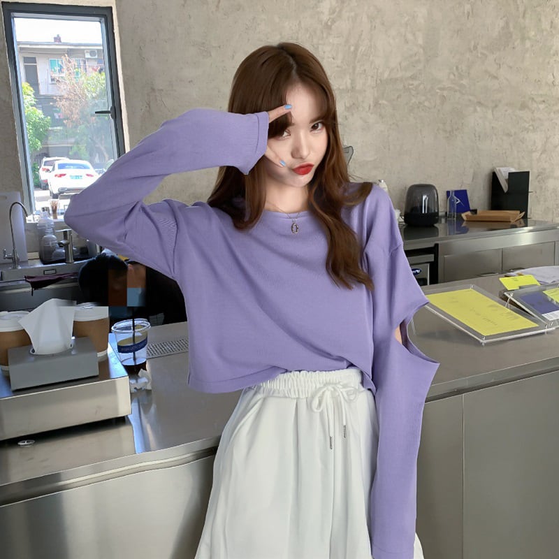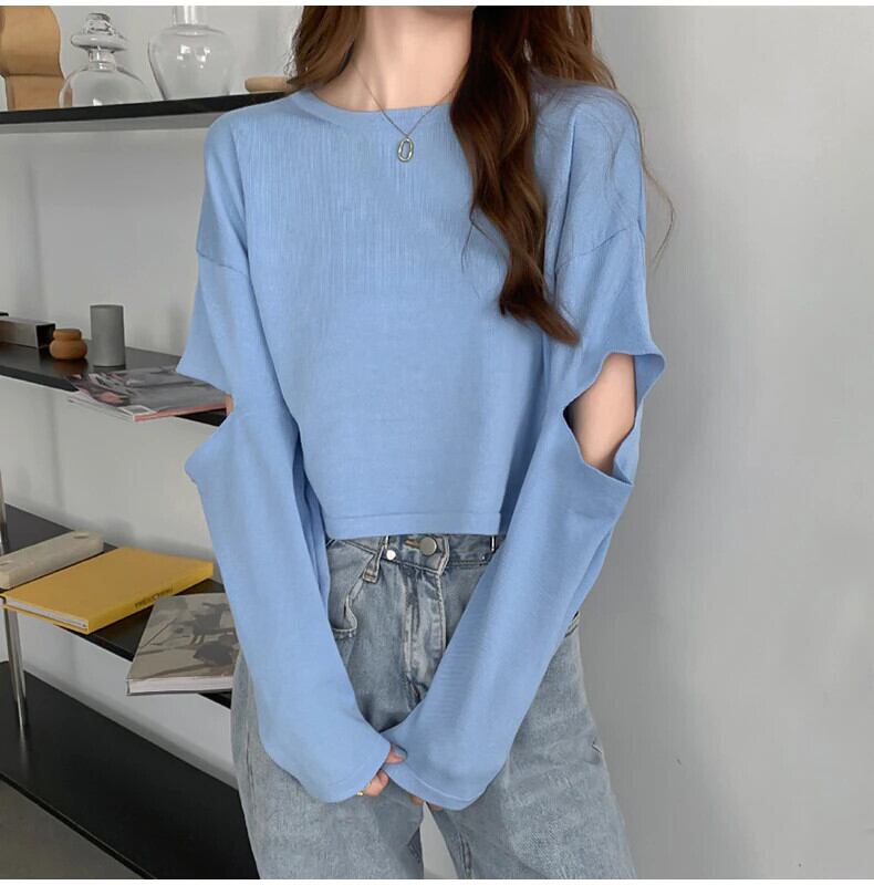 秋長袖穴女性 Tシャツスリム黒クロップトップ若い Tシャツ韓国の基本的なショート Tシャツ女性服 ロング ブラック オータム 秋物 Aim1098769146