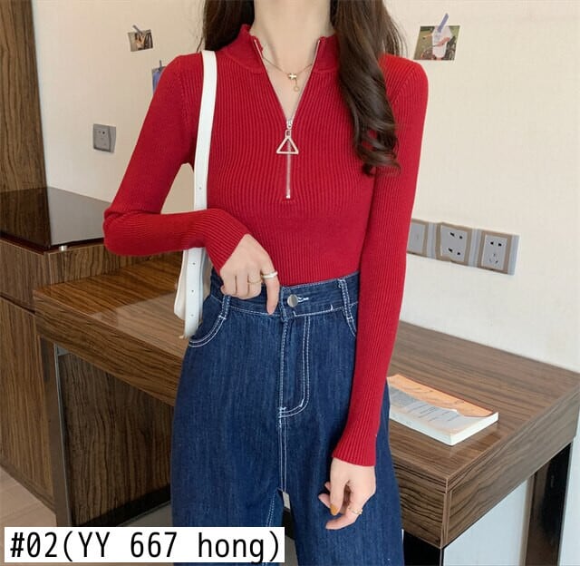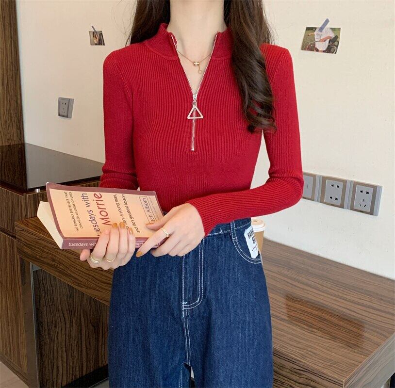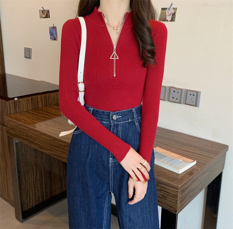 ジッパーニットセーター女性スリムフィット秋冬底入れプルオーバーシャツホワイトベーシックトップス固体薄いセーター オータム 秋物 ウィンター 冬物 ソリッドカラー Aim95204513580