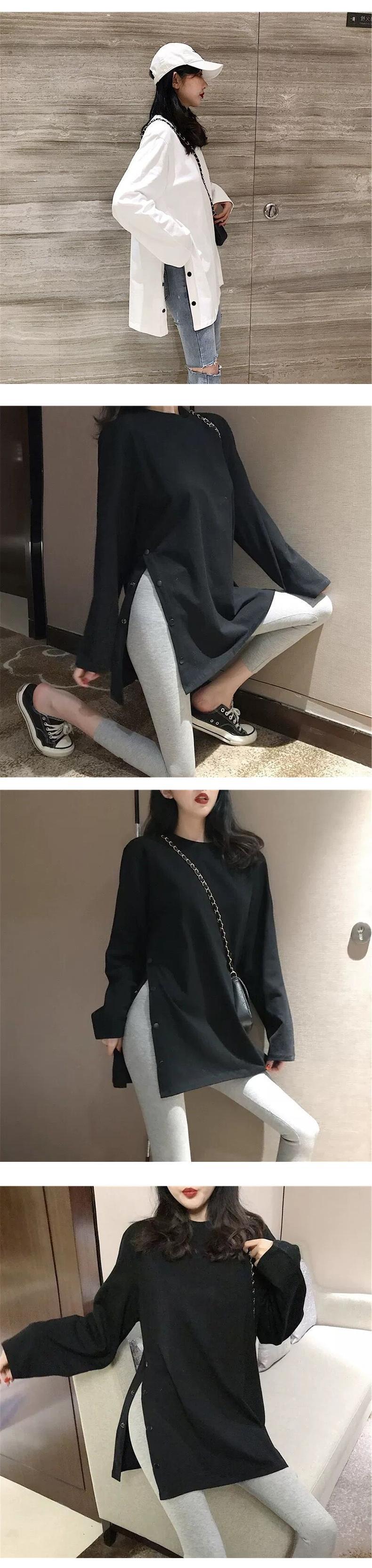 2022 春スプリットサイドボタン白黒ロング Tシャツ O ネック女性シャツ秋原宿固体特大 Tシャツトップス ホワイト ブラック かわいい スプリング 春物 オータム 秋物 Oネック ソリッドカラー Aim8949095732