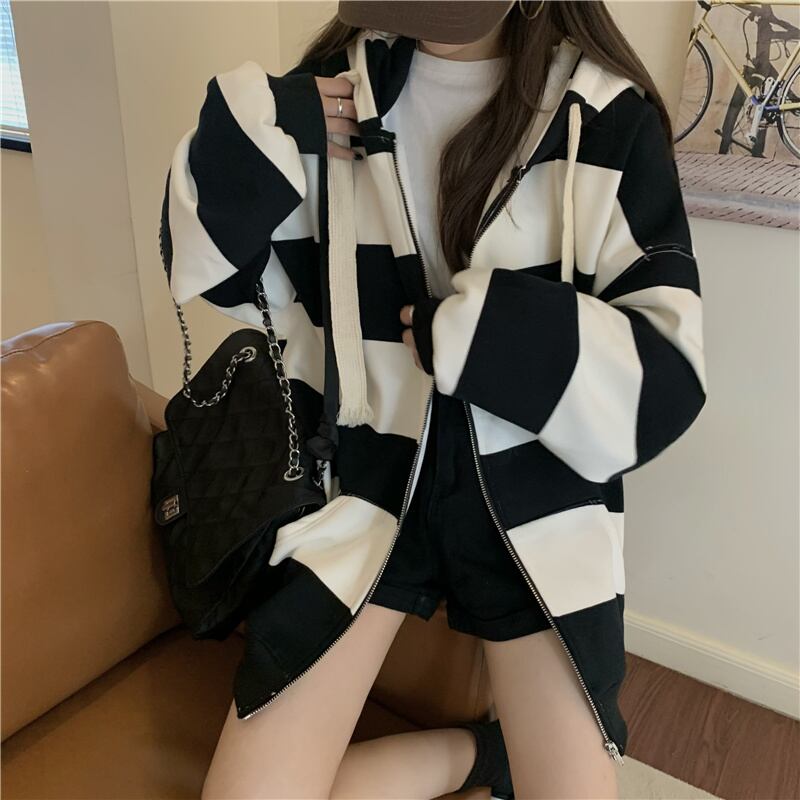 薄いパーカー女性ジッパーフード付きスウェットシャツストライプ長袖特大パーカー上着女性ポケットカーディガンジャケット ロング Aim1413212480
