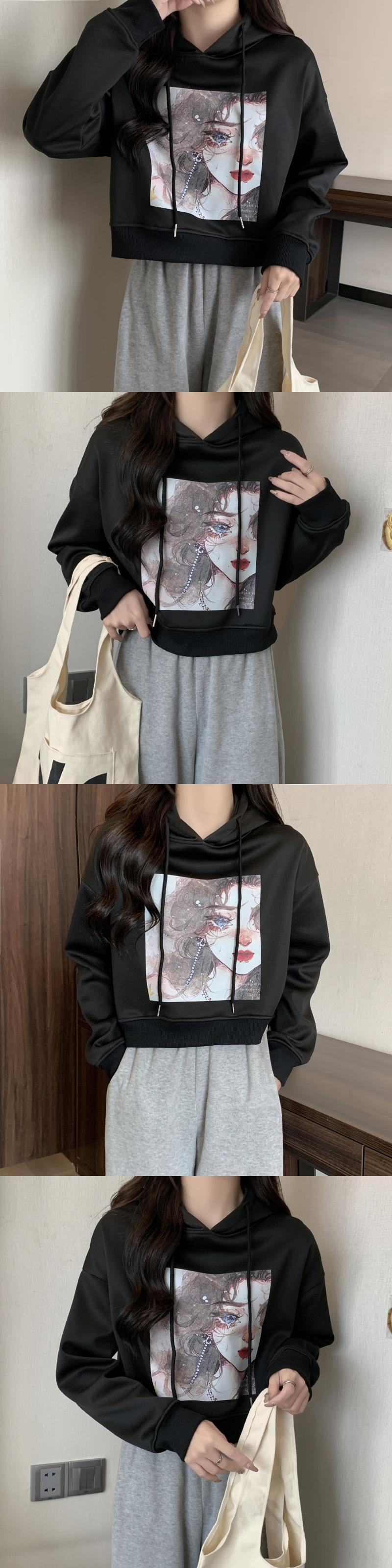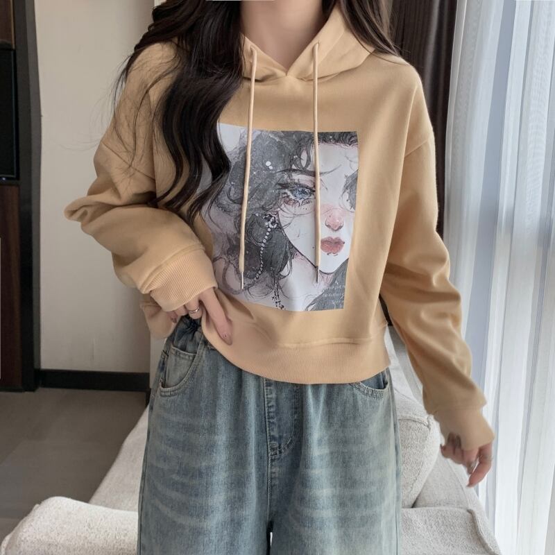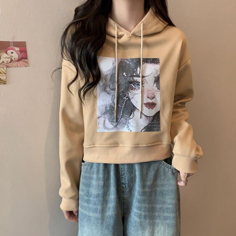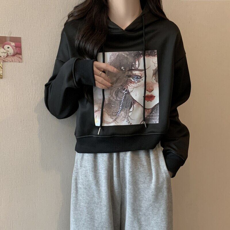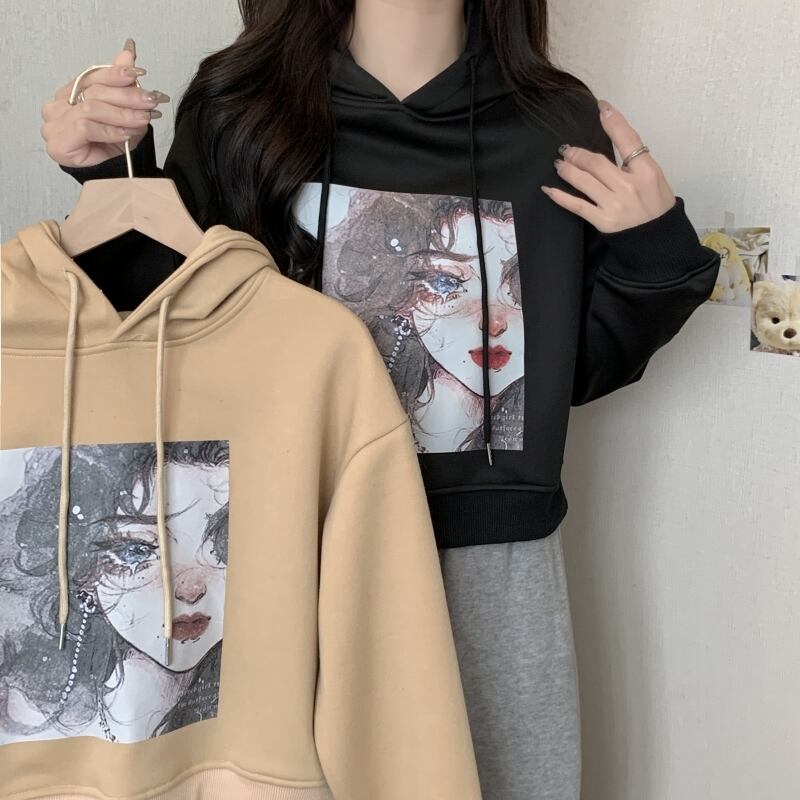 秋冬フリース暖かいパーカー女性クロップトップスカジュアル緩い漫画プリントパーカー韓国かわいいベルベット厚みのフード付きスウェットシャツ 大人ガーリー スウィート キュート オータム 秋物 ウィンター 冬物 Aim93406405444