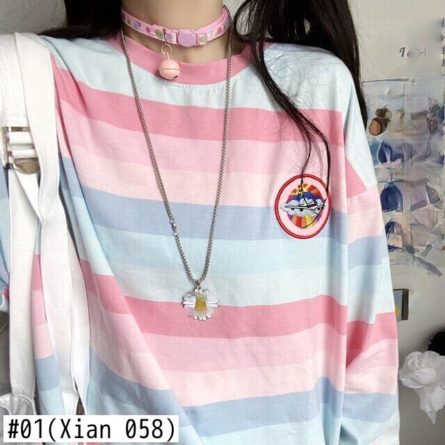 秋のカラフルなストライプ tシャツ特大刺繍底入れ Tシャツ女性長袖かわいいピンクトップス y2k 服 ロング 大人ガーリー オータム 秋物 Aim61313869978