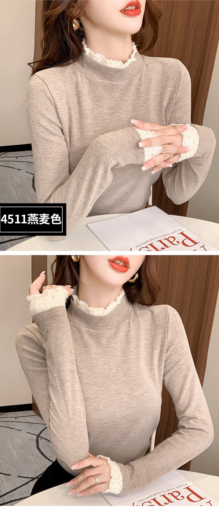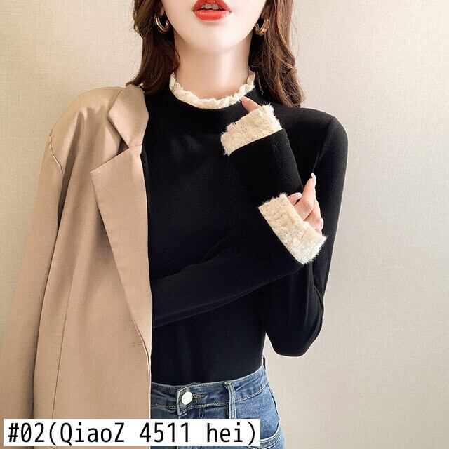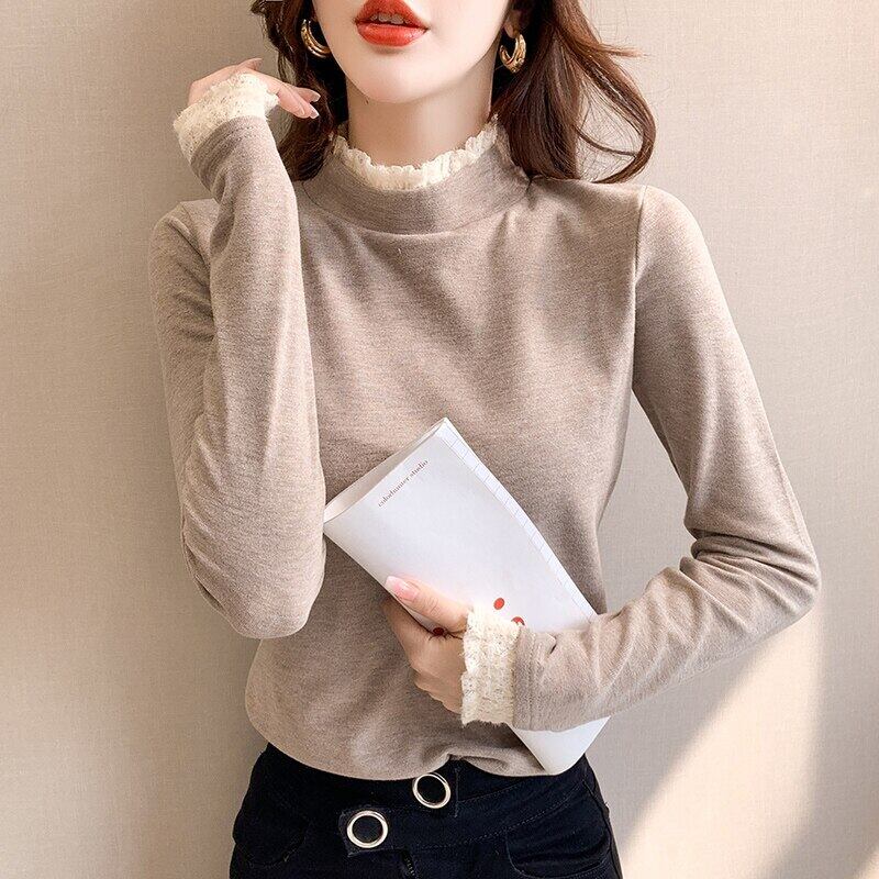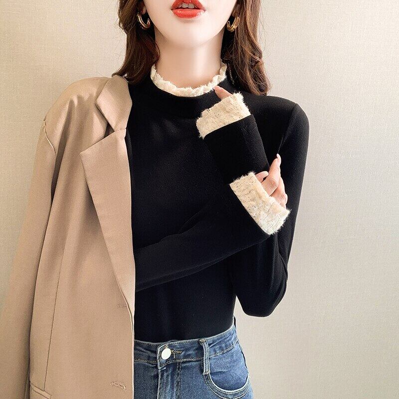 秋冬ベルベットレース女性 Tシャツ韓国長袖固体ハーフタートルネックスリム底入れ Tシャツ厚く暖かいトップス ロング オータム 秋物 ウィンター 冬物 ソリッドカラー Aim58184331247