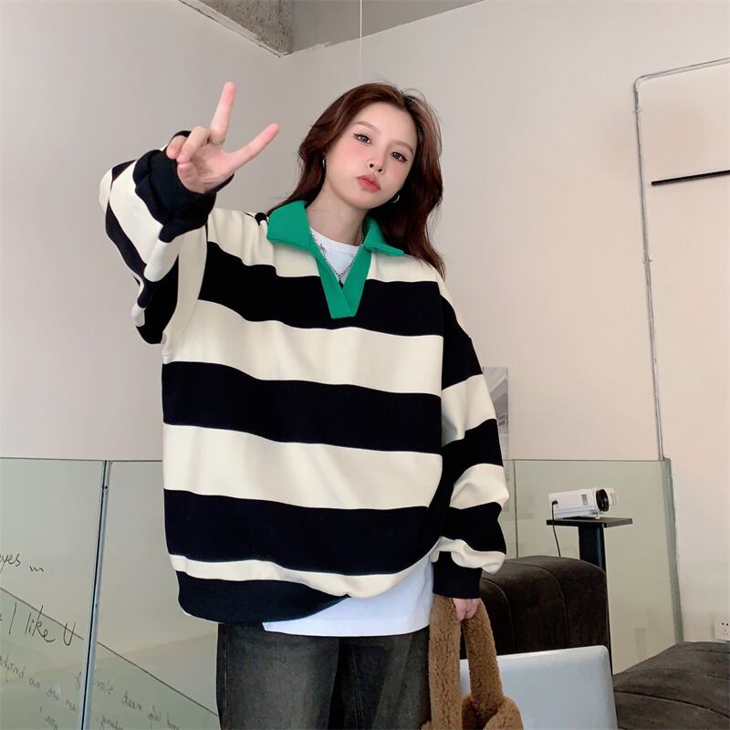 原宿ストライプ特大パーカー秋冬フリースパーカー女性カジュアルフルスリーブベルベット V ネックコットンスウェットシャツ y2k トップス かわいい オータム 秋物 ウィンター 冬物 Vネック Aim18181448794