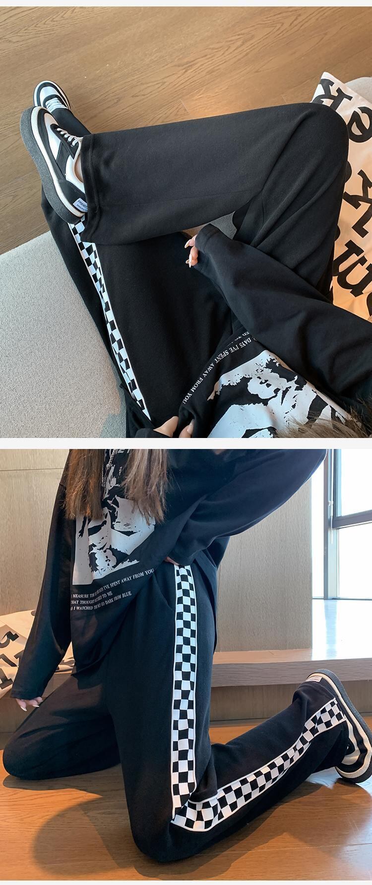 秋冬ウエストベルベットフリースズボン厚いワイドレッグパンツジョギング女性サイドチェック柄スウェットパンツスポーツストリート オータム 秋物 ウィンター 冬物 ワイドパンツ Aim94536113015