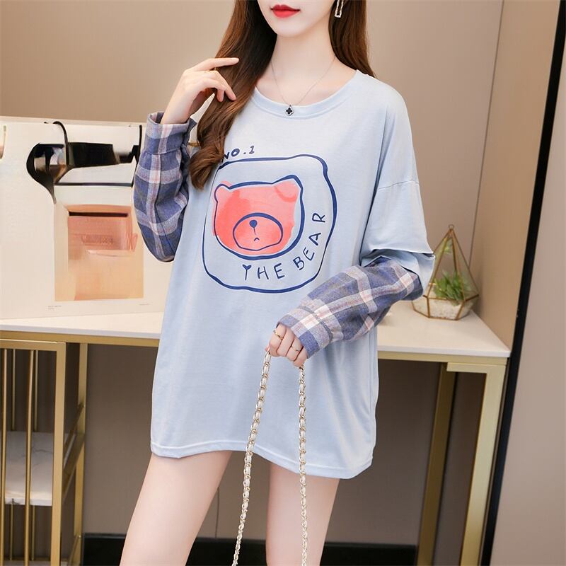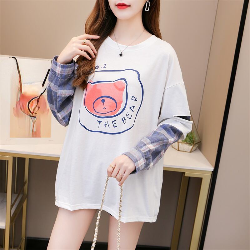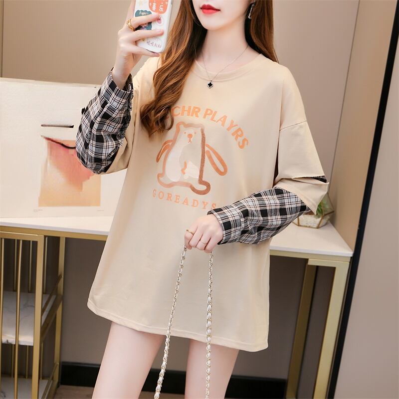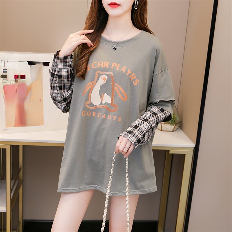 原宿コットンレタープリント Tシャツチェック柄パッチワーク特大 tシャツ女性服かわいい長袖トップス学生ストリート ロング 大人ガーリー Aim30204045468