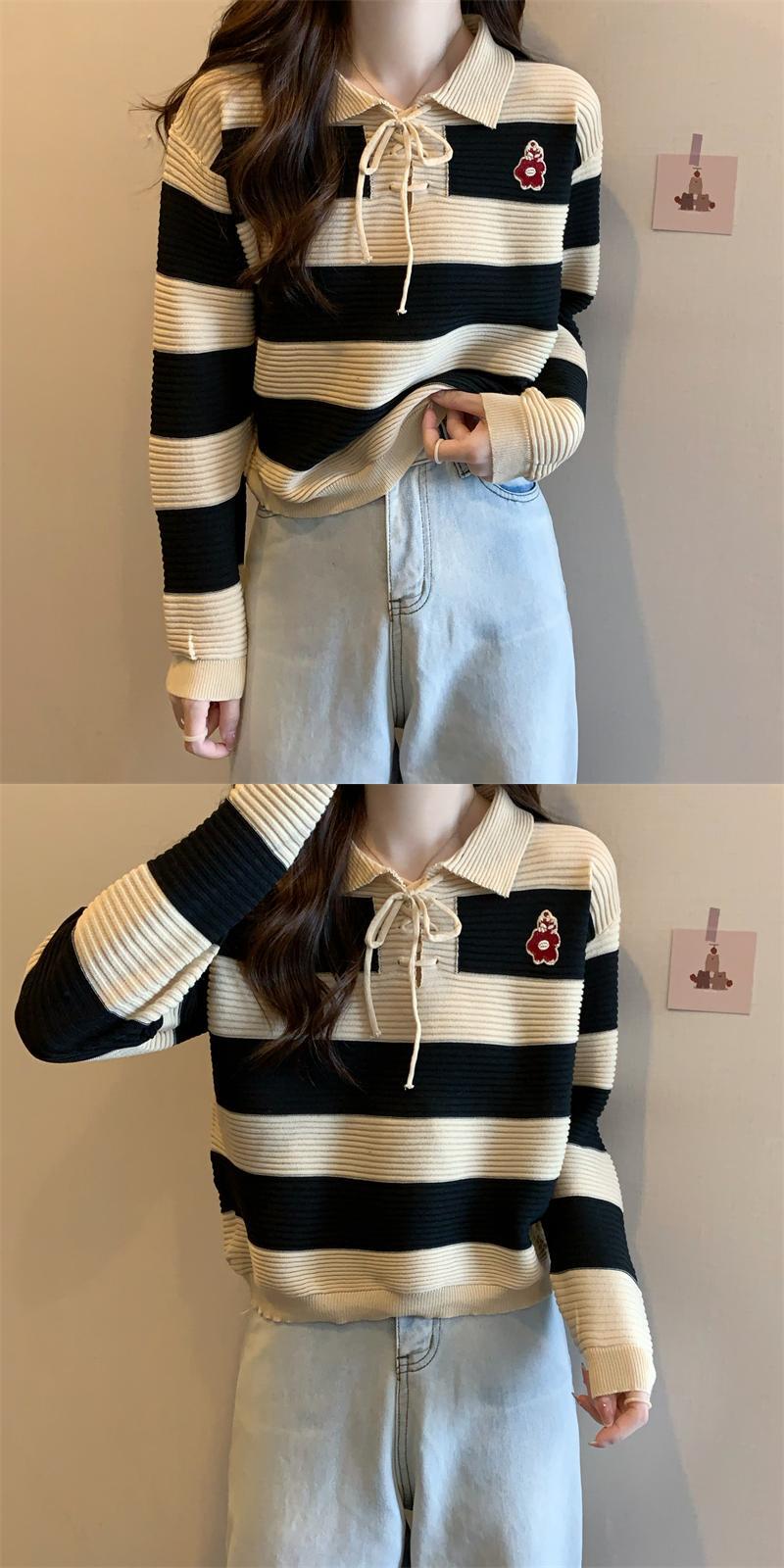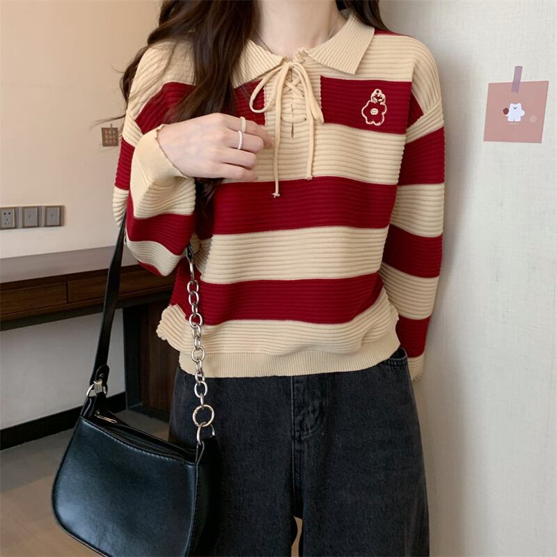 韓国底入れシャツ女性の赤トップストライプパッチワークカジュアルルーズドールカラーニットセーター女性プルオーバーオールマッチセーター レッド Aim42066499083
