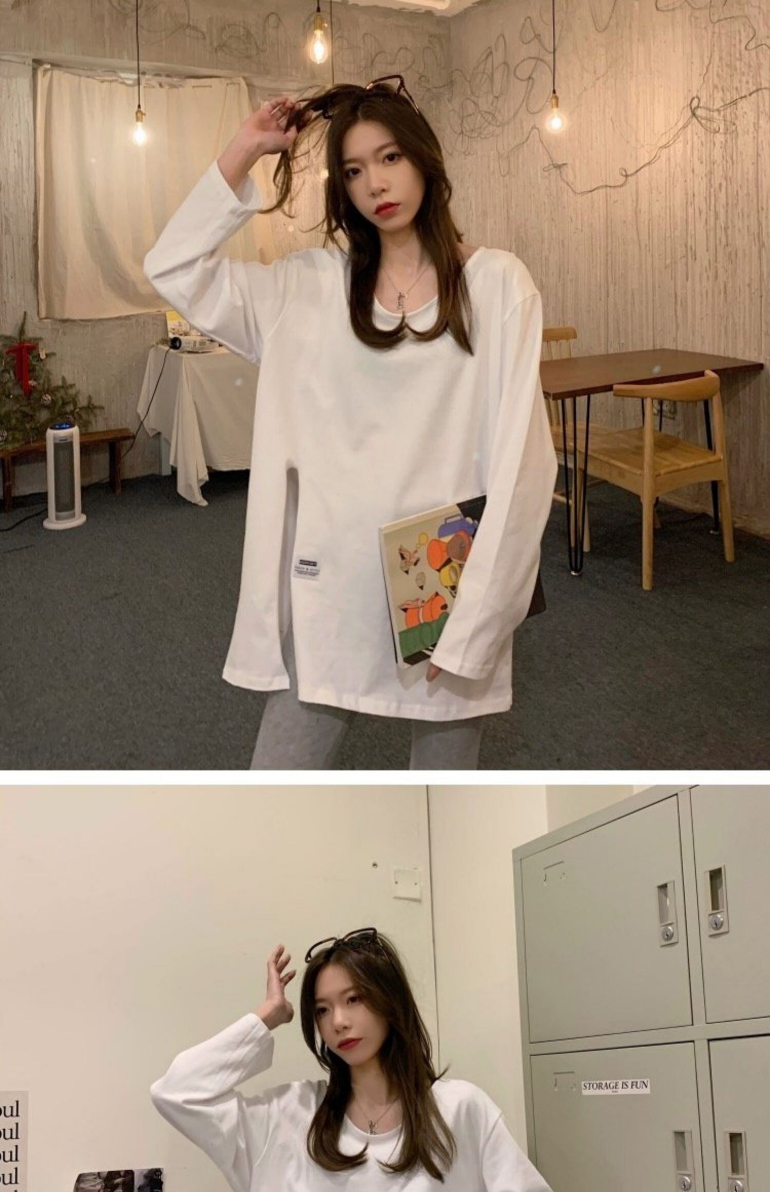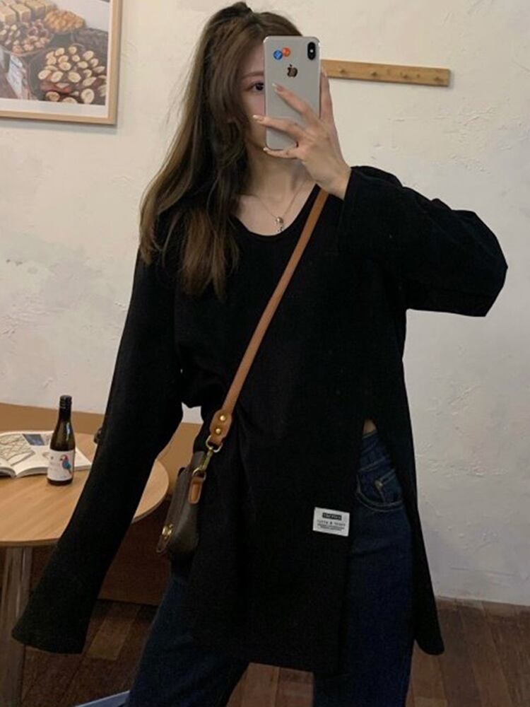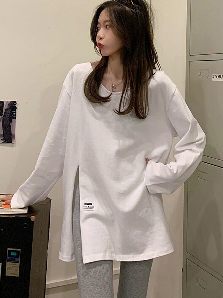 原宿長袖クリエイティブサイドスリット純粋な綿の女性 tシャツ固体特大女性 Tシャツホワイトトップロングストリート コットン かわいい ピュア ソリッドカラー Aim60764590284