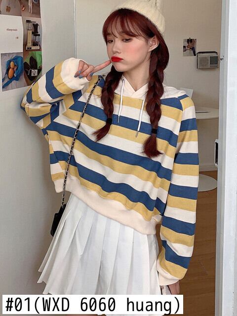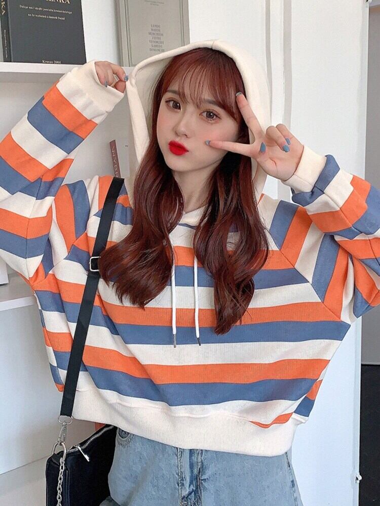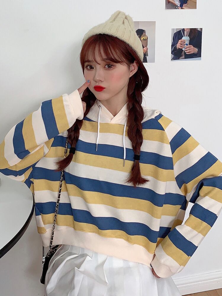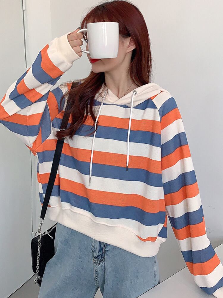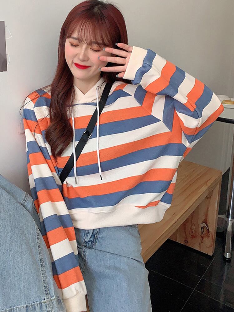 パーカー女性カラフルなストライプパッチワークフード付きスウェット若いトップス原宿かわいいショートパーカー女性服 シャツ 大人ガーリー Aim28231371233