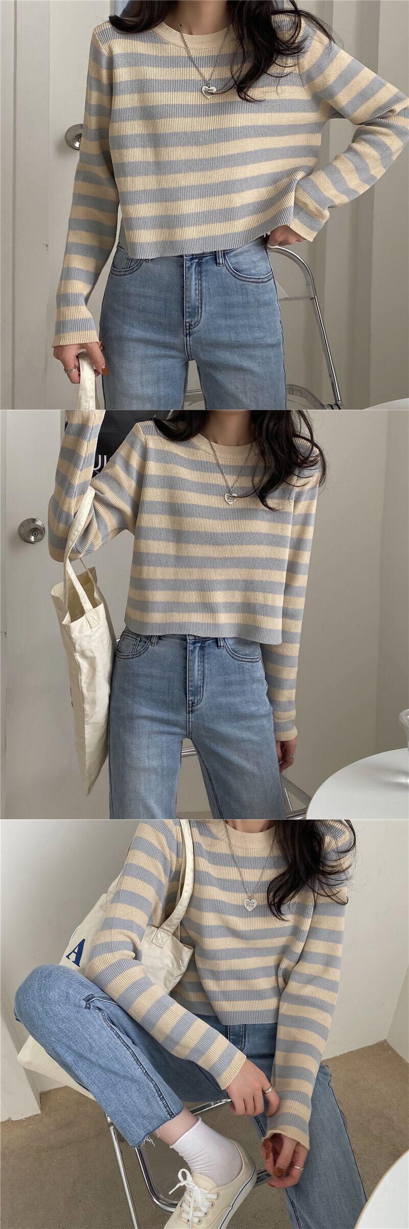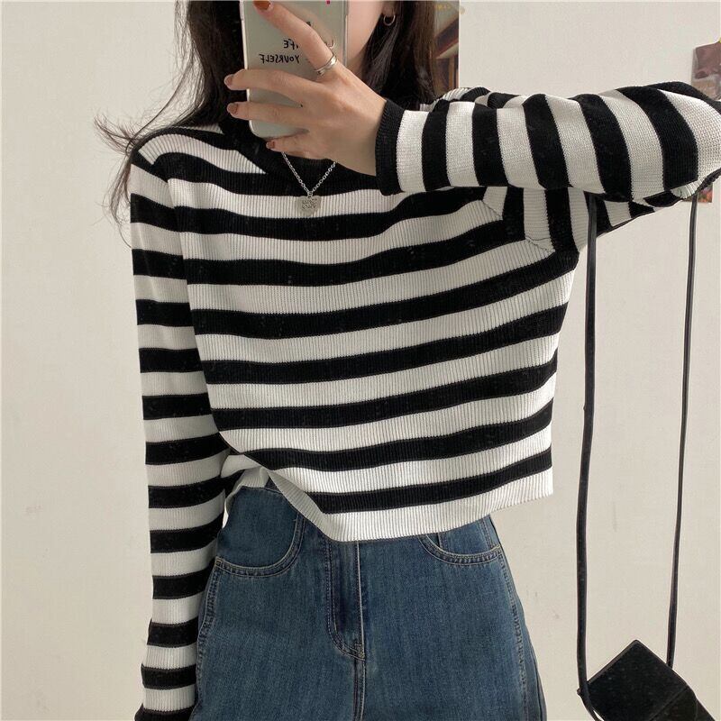 秋スリムニットセータープルオーバー O ネック長袖ストライプセーター Tシャツジャンパークロップトップ Y2K 女性服 ロング オータム 秋物 Oネック Aim42904812875