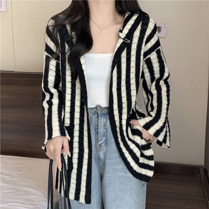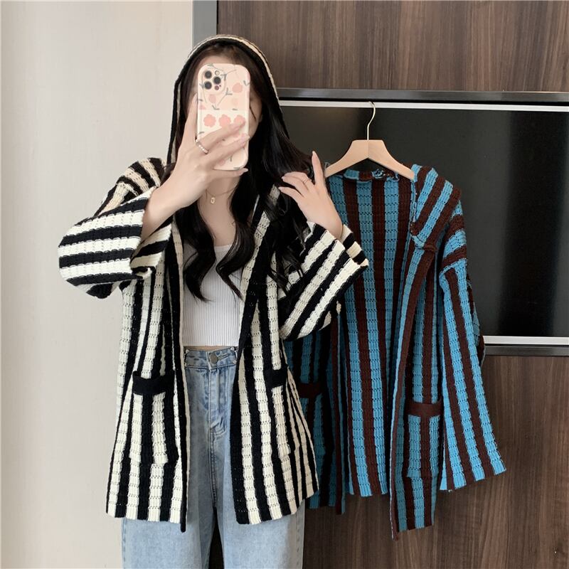 秋冬 V ネックニットセーター女性ルースストライプフード付きカーディガン長袖ソフトブルートップニットコート ロング オータム 秋物 ウィンター 冬物 Vネック Aim74296682673