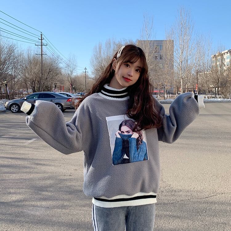 秋冬厚み子羊フリース特大パーカー女性服原宿タートルネックプリントスウェットシャツカジュアルフルスリーブパーカー かわいい オータム 秋物 ウィンター 冬物 Aim37716394327