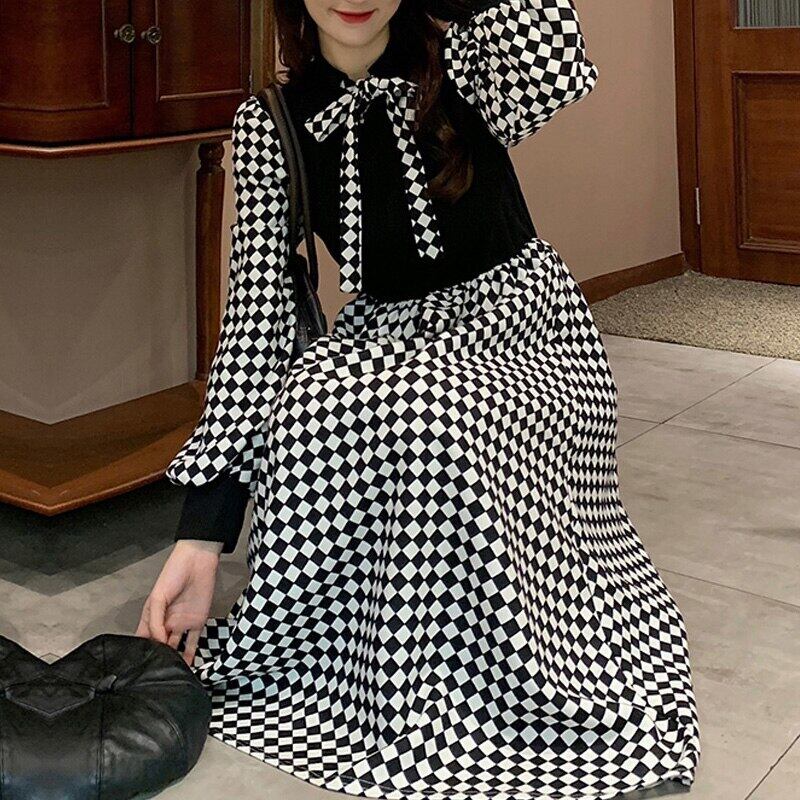 2022 秋冬千鳥格子弾性ウエストドレス女性緩いレジャー長袖コーデュロイ黒ドレス Vestido ロング ブラック エラスティック 伸縮 オータム 秋物 ウィンター 冬物 Aim22160979214