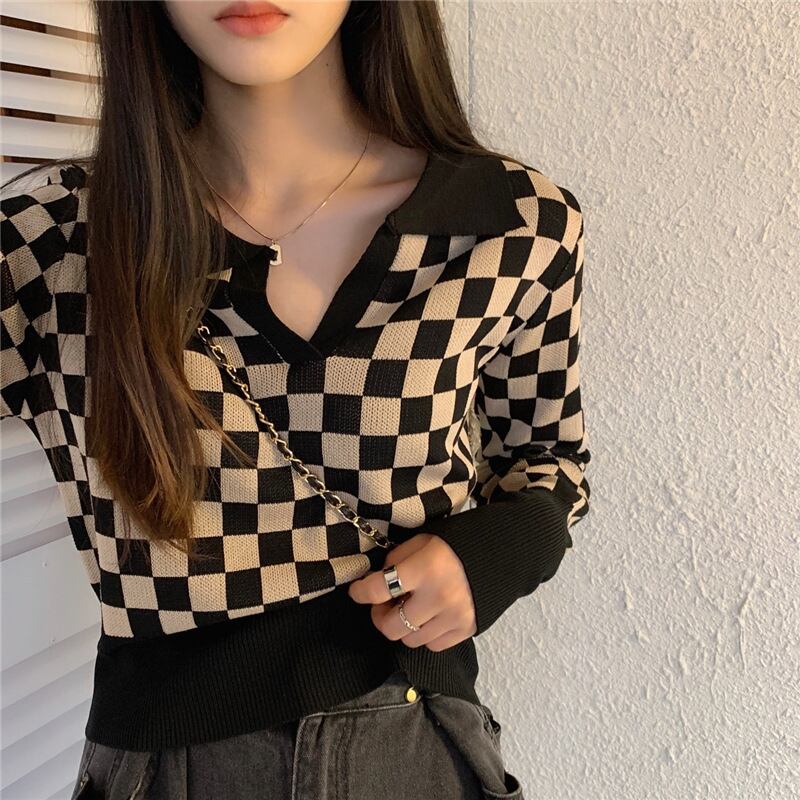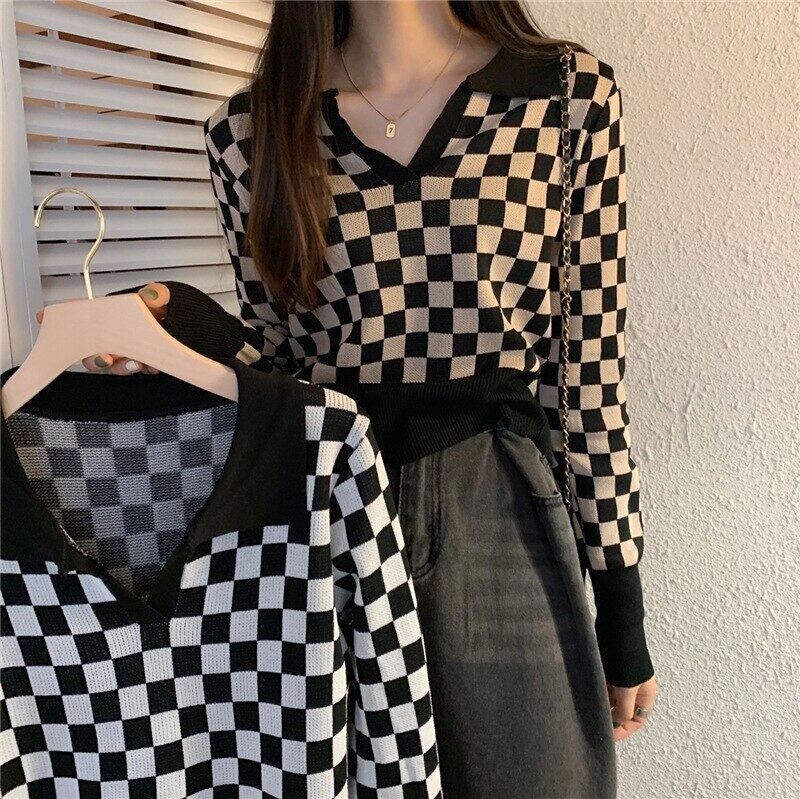ファッションニットセーター女性 2022 秋 V ネックスリム黒トップス長袖格子縞のセーター底入れ y2k 女性 ロング ブラック オータム 秋物 Vネック Aim10746499447
