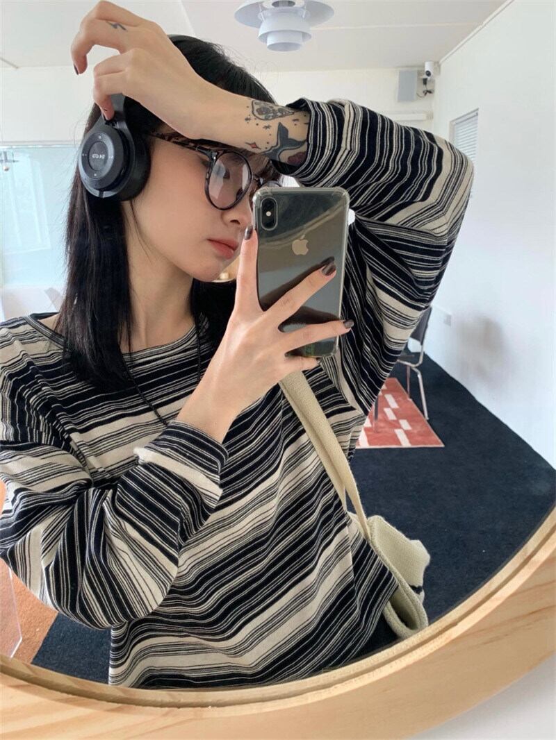 原宿ゴスロース長袖ストライプ Tシャツ女性 O ネック Tシャツ基本的な黒 y2k トップス女性服 ロング ブラック かわいい Oネック Aim99964571285