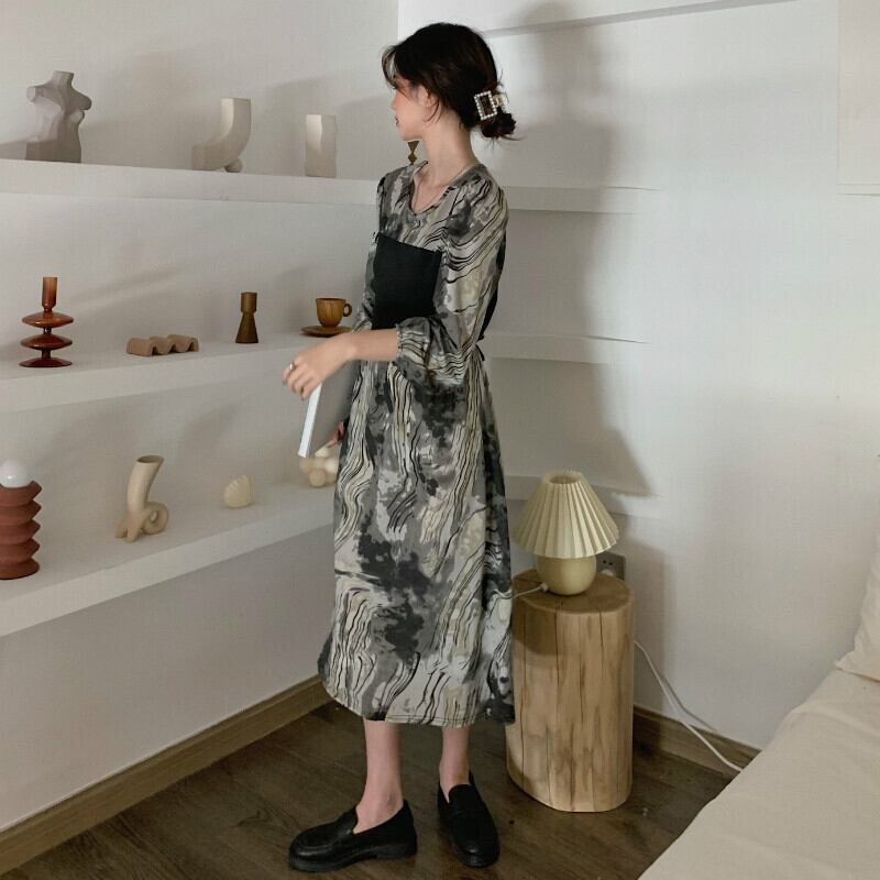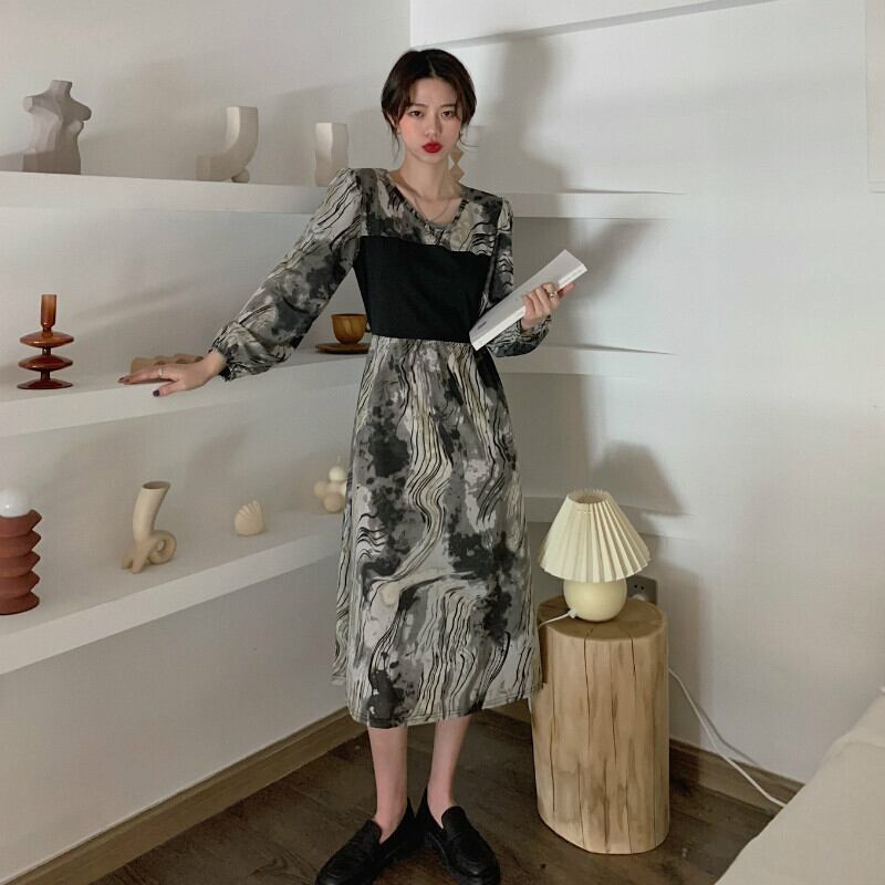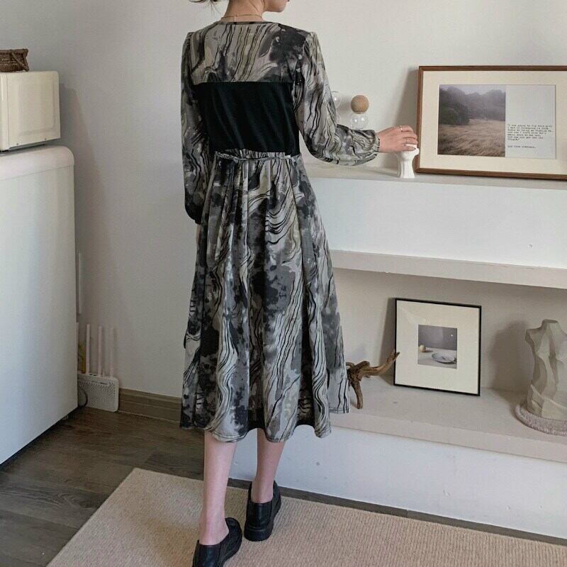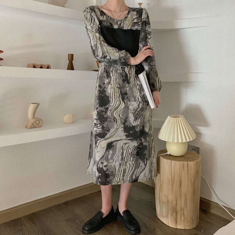 2022 秋のヴィンテージパッチワークパーティークラブ黒のドレスの女性ルース A ラインドレス長袖絞り染めボディコンドレス ロング ブラック オータム 秋物 Aライン ビンテージ Aim32121916182