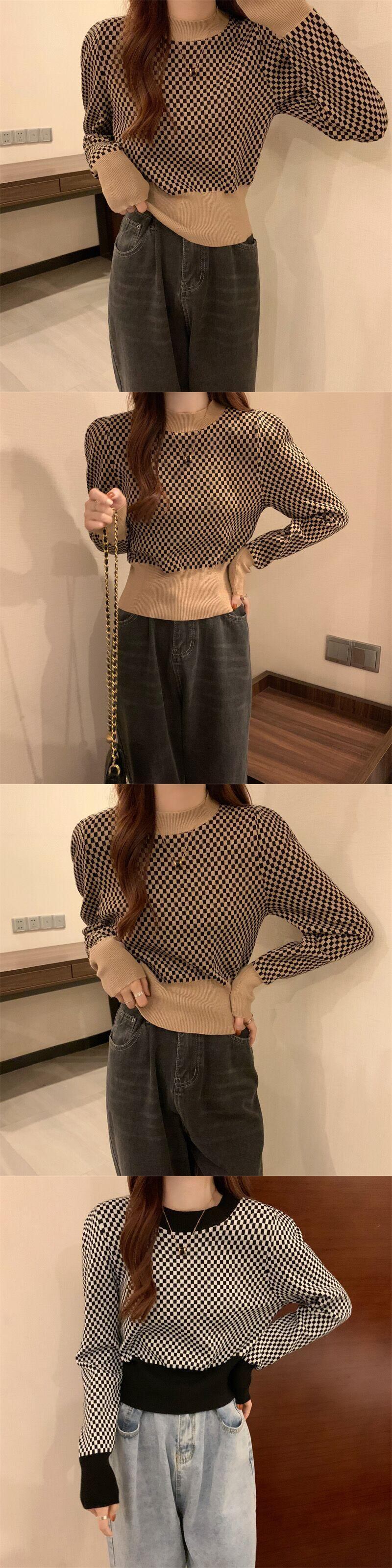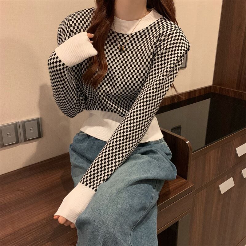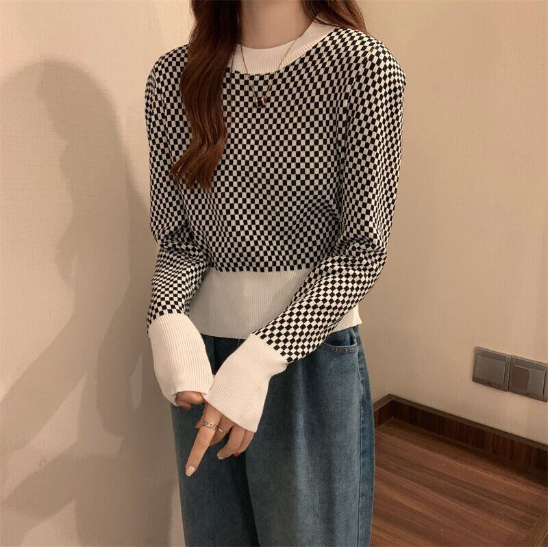 秋スリムニットセータープルオーバー基本的な長袖チェック柄セーター Tシャツジャンパークロップトップ Y2K 女性服 ロング オータム 秋物 Aim21194769641