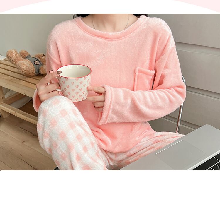 秋冬ピンクチェック柄ぬいぐるみ暖かいフランネルパジャマセットカジュアルソフトコーラルベルベットパジャマセット女性ホーム服 オータム 秋物 ウィンター 冬物 Aim23624018752