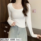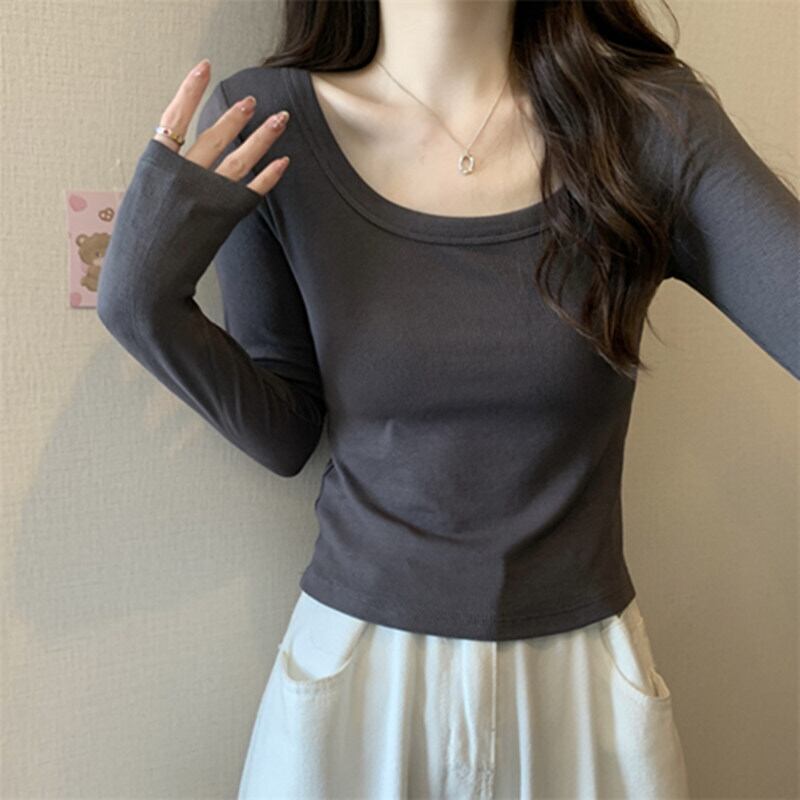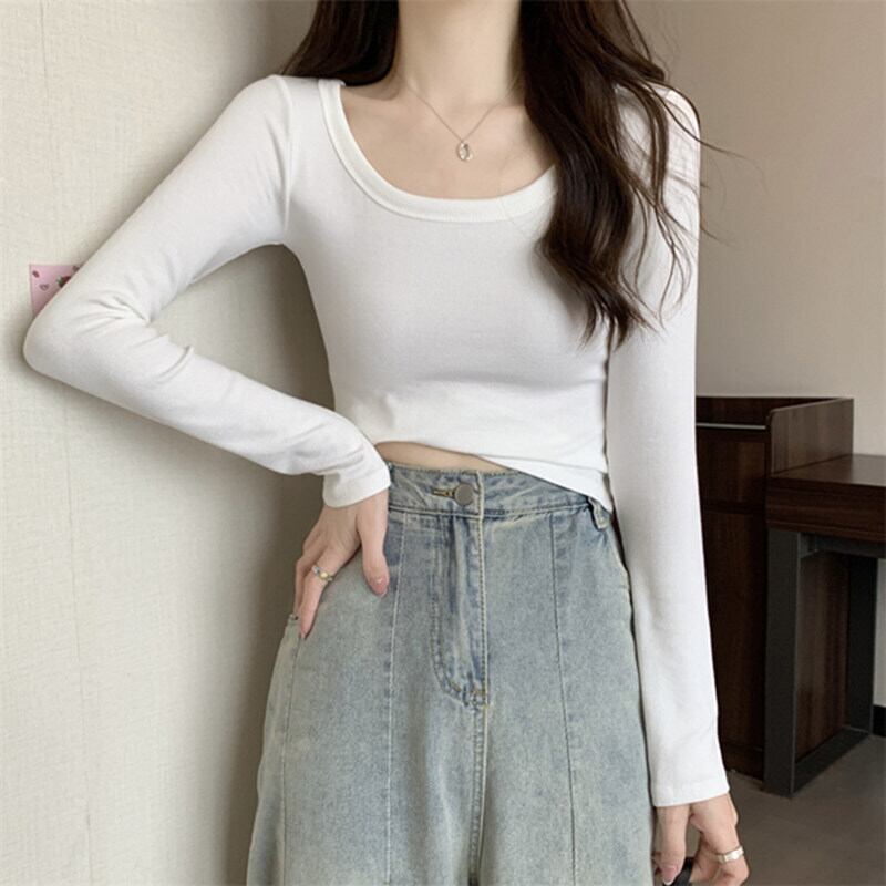 若いクロップドトップ秋 O ネック長袖 Tシャツ女性原宿スリムオールマッチ白 Tシャツ Y2K 服 ロング ホワイト かわいい オータム 秋物 Oネック Aim14623434766