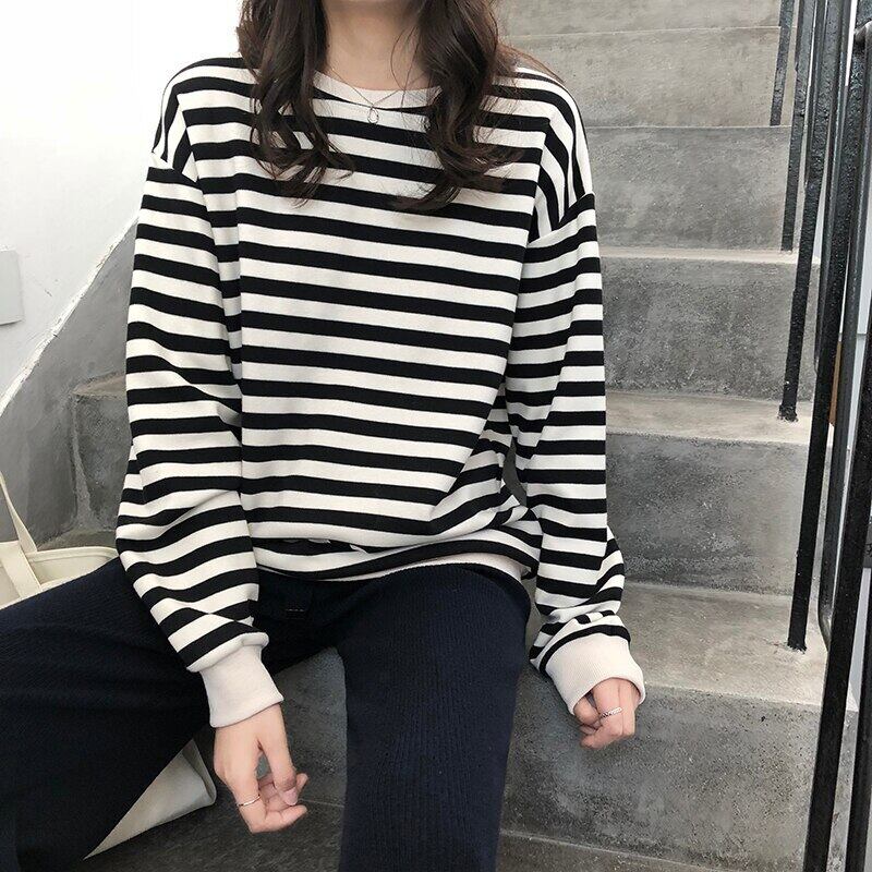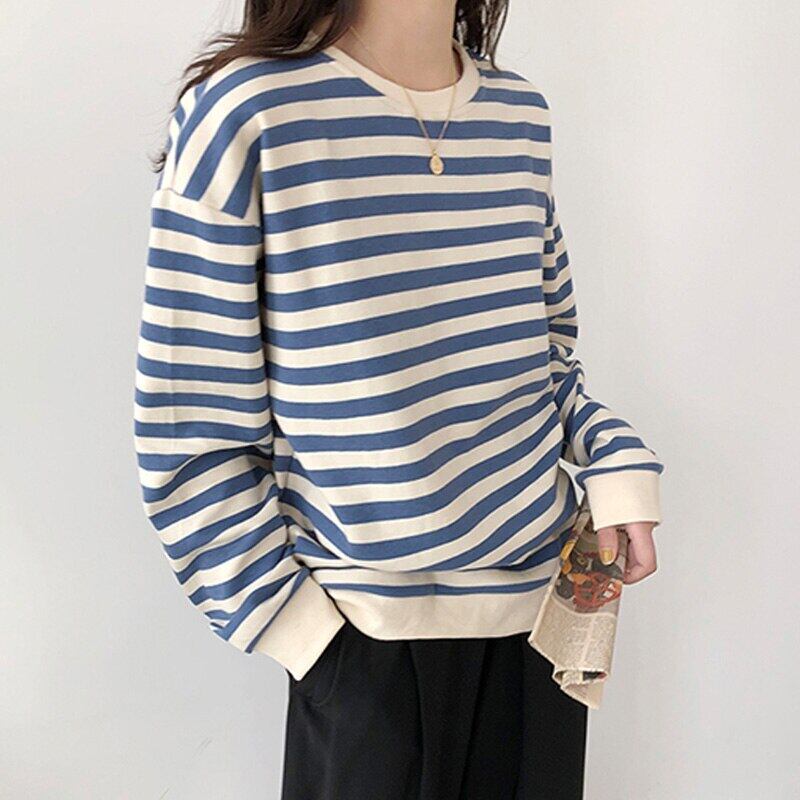 ボーイフレンド特大カジュアルパーカー女性原宿ストリートストライプパッチワークスウェット O ネックコットンプルオーバー薄いトップス シャツ かわいい Oネック Aim32676786727