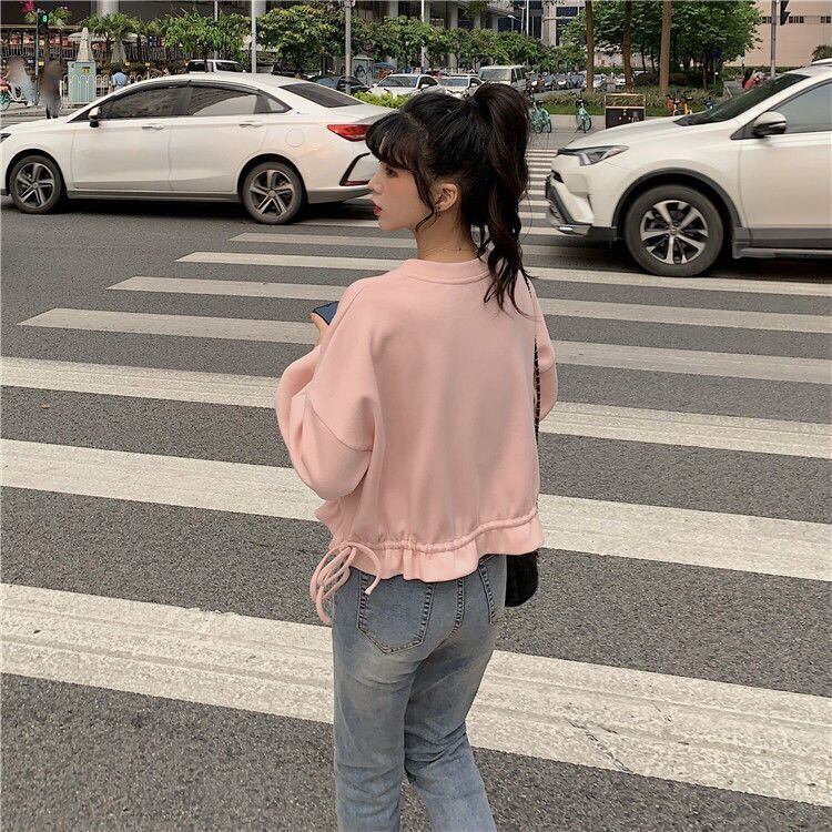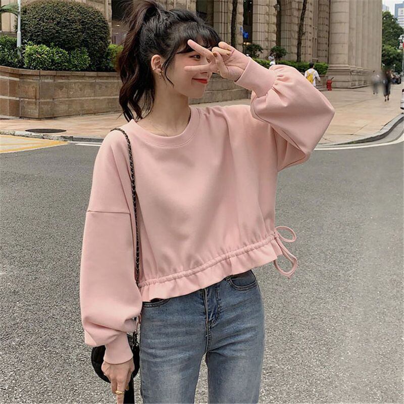 韓国かわいいクロップトップカジュアル巾着長袖 O ネックパーカー女性固体薄いトレーナー女性服若いトップス ロング 大人ガーリー Oネック ソリッドカラー Aim97965212487