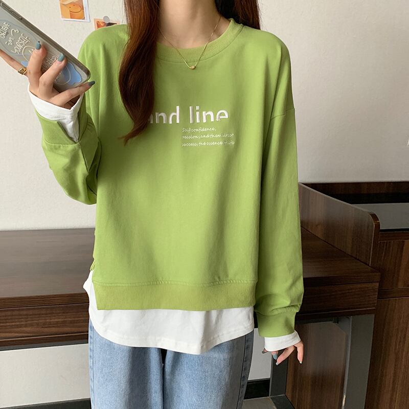 春韓国薄いパーカー女性秋 O ネックレタープリントパッチワーク偽 2 スウェットシャツカジュアル特大パーカーかわいい服 大人ガーリー スプリング 春物 オータム 秋物 Oネック Aim23125217008