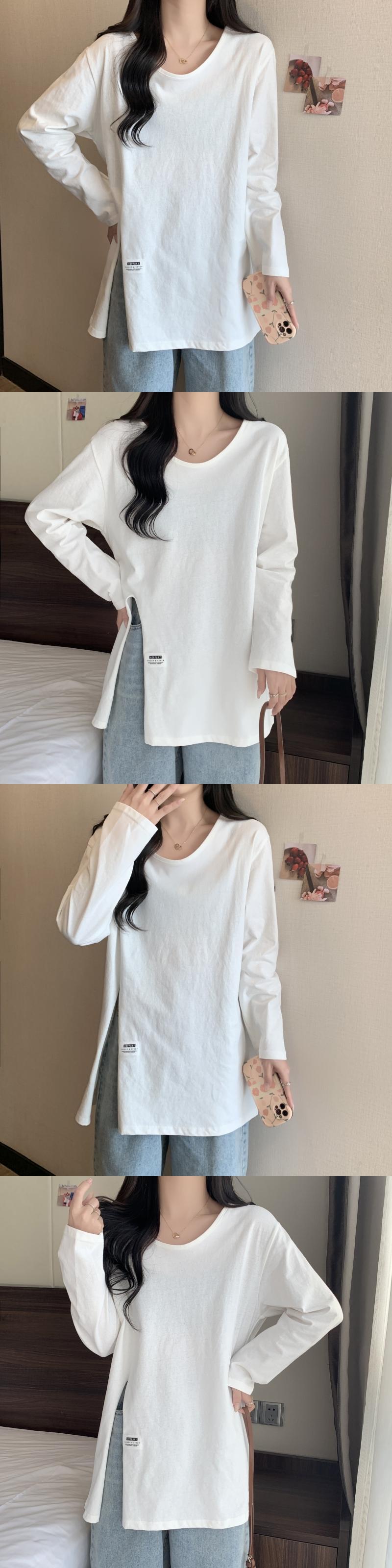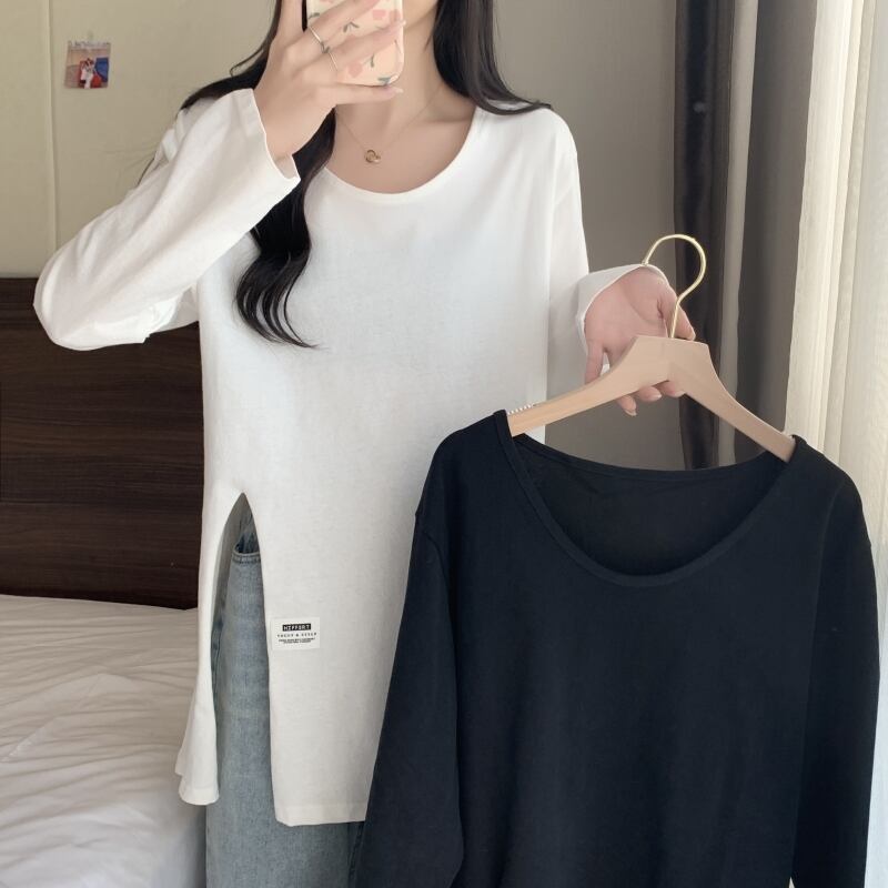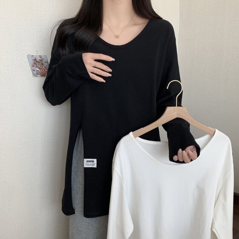 原宿ゆるい厚く暖かいサイドスプリット底入れ Tシャツ女性秋冬ベルベット長袖固体 Tシャツ黒 y2k トップ ロング ブラック かわいい オータム 秋物 ウィンター 冬物 ソリッドカラー Aim90023868328