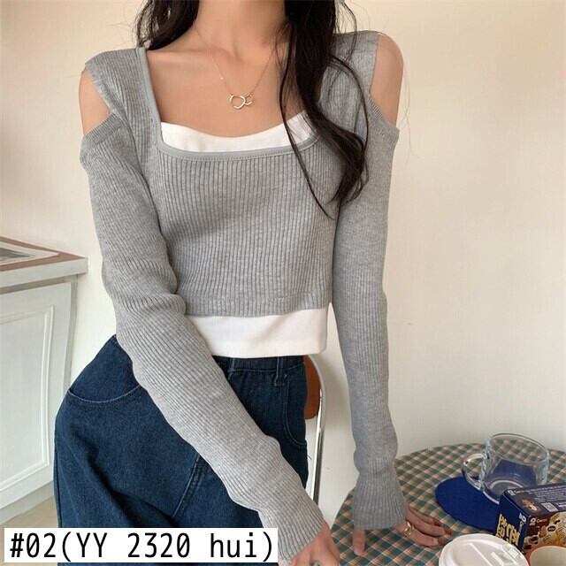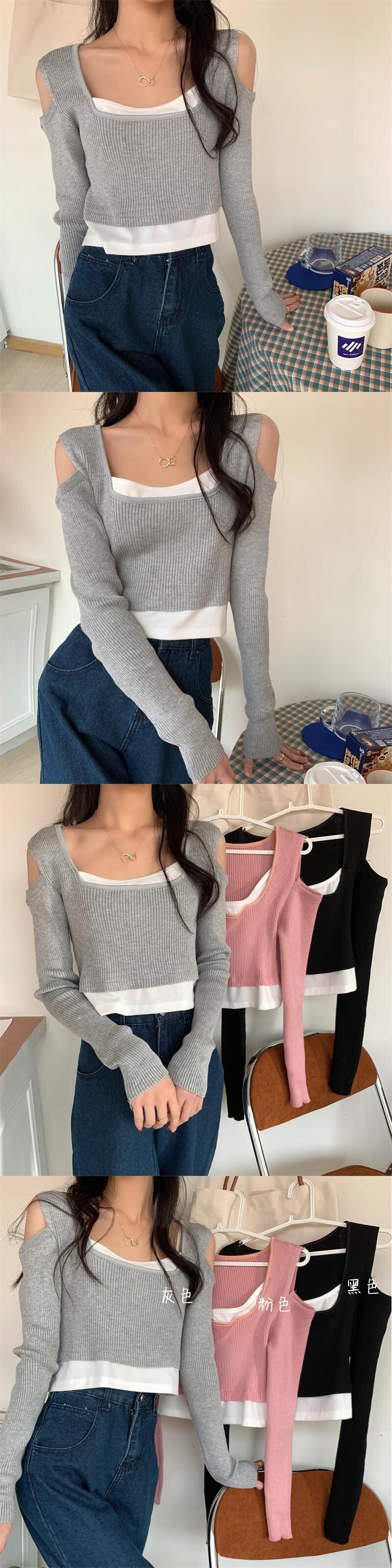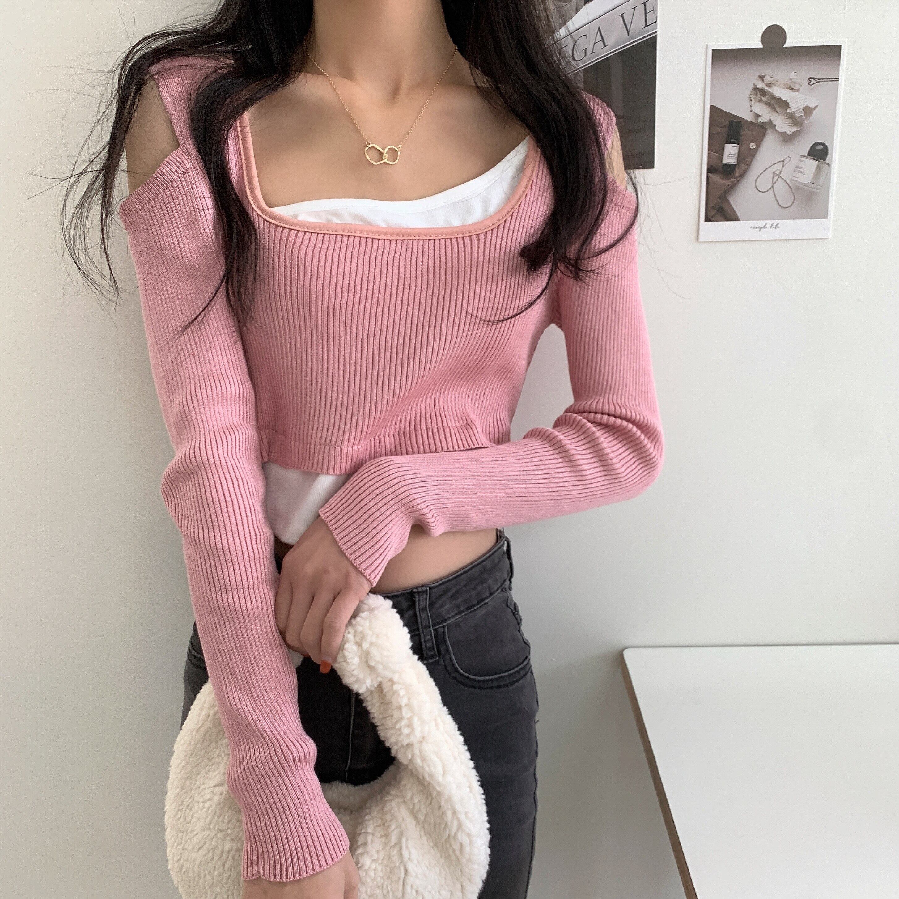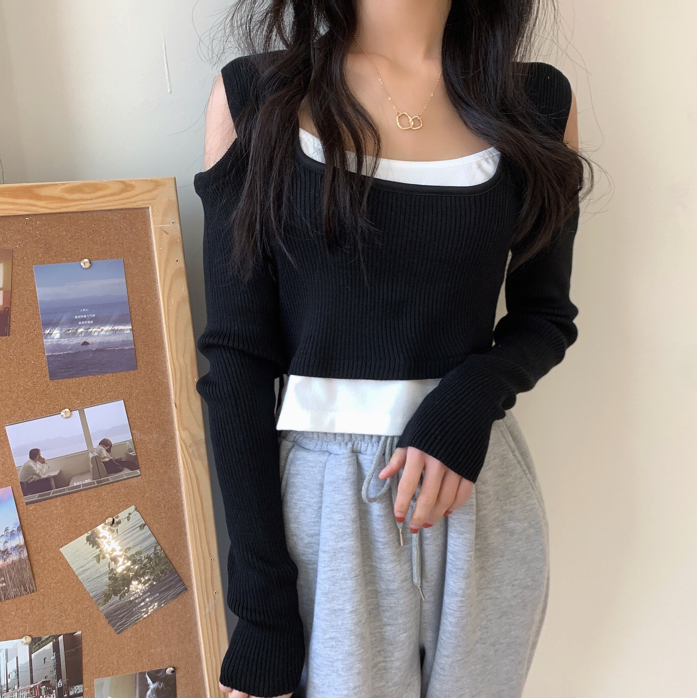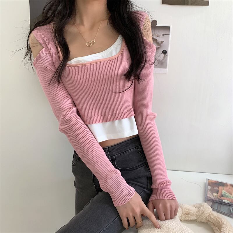 原宿女性ニットセーター長袖パッチワーク偽ツーピース tシャツ中空アウトクロップトップスリムソリッド女性セーター ロング かわいい ソリッドカラー Aim38471085597