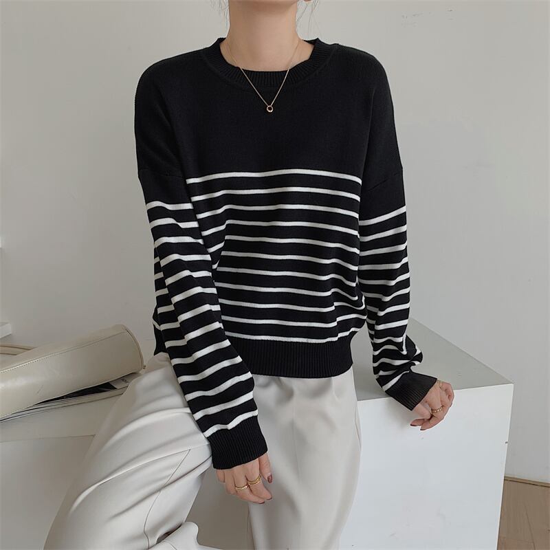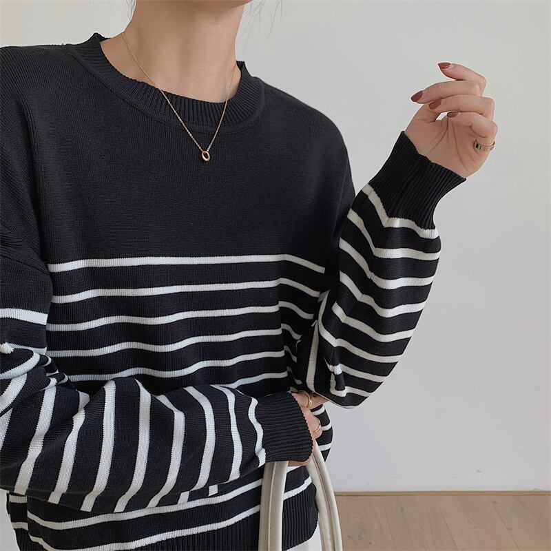 2023 春秋の女性のカジュアルルーズ O ネック長袖ストライプセーター怠惰なソフトニットジャンパーオールマッチプルオーバー ロング スプリング 春物 オータム 秋物 Oネック Aim26333862734