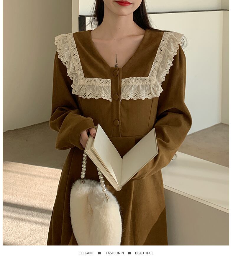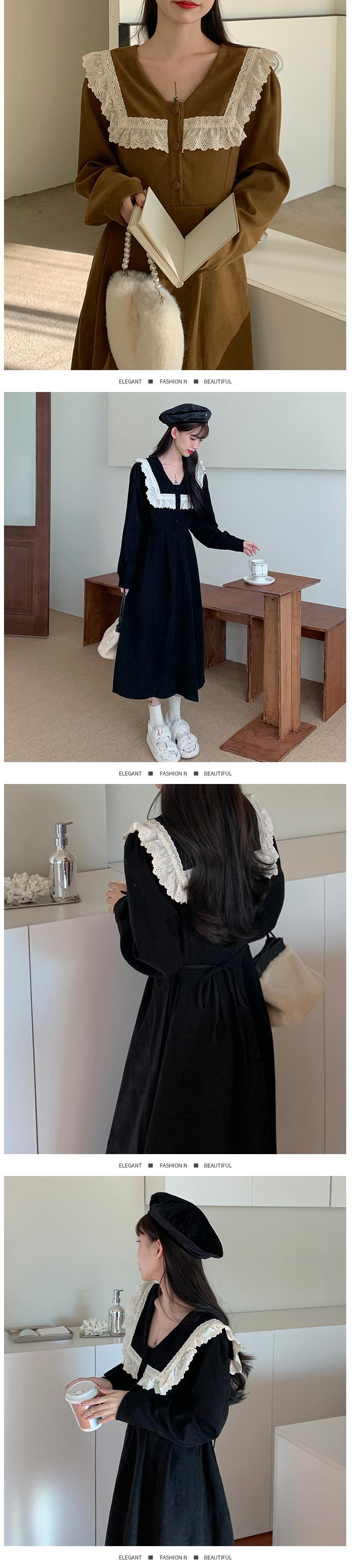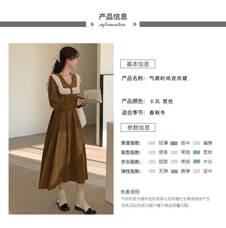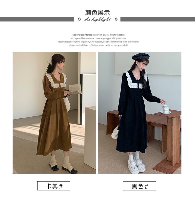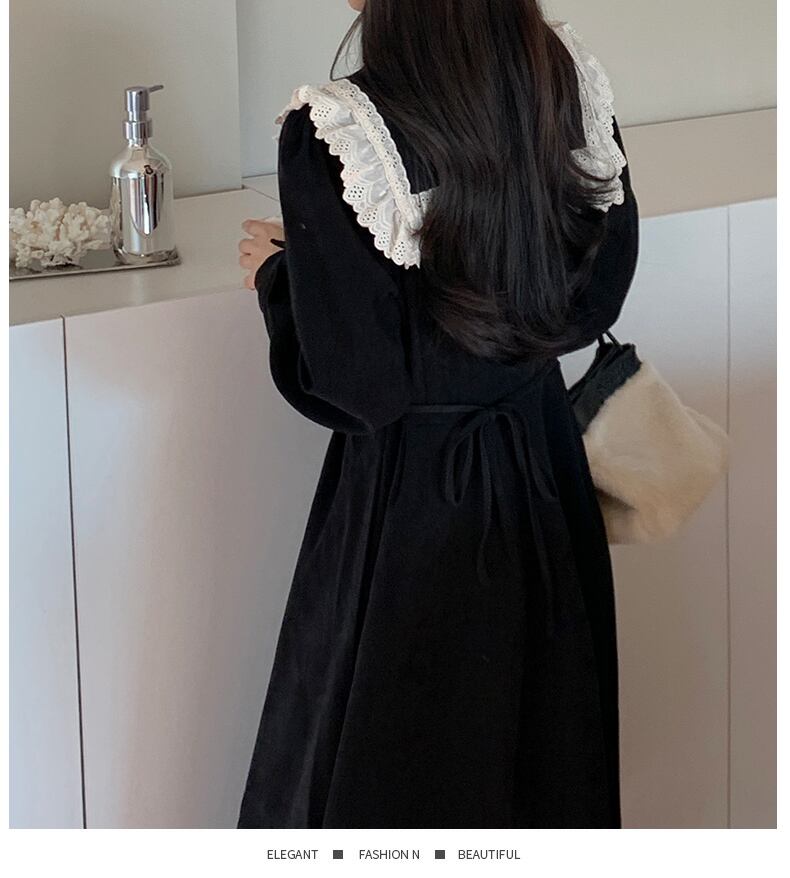 秋冬フランス長袖レースステッチレジャー緩い黒ドレス厚みコーデュロイボディコンドレス女性 Vestidos ロング ブラック オータム 秋物 ウィンター 冬物 Aim92171912880