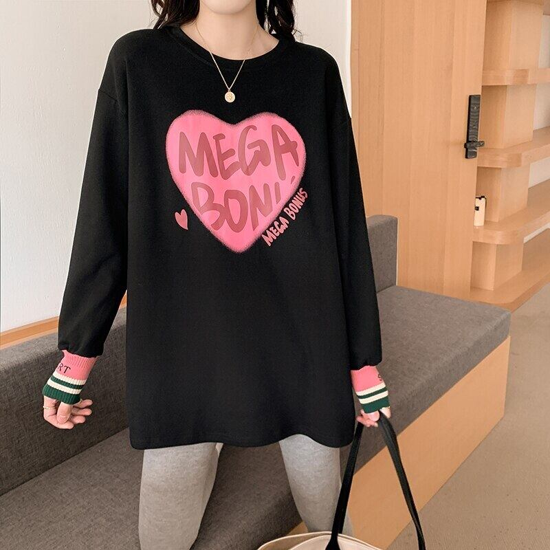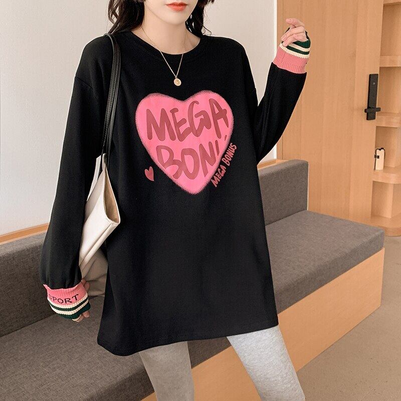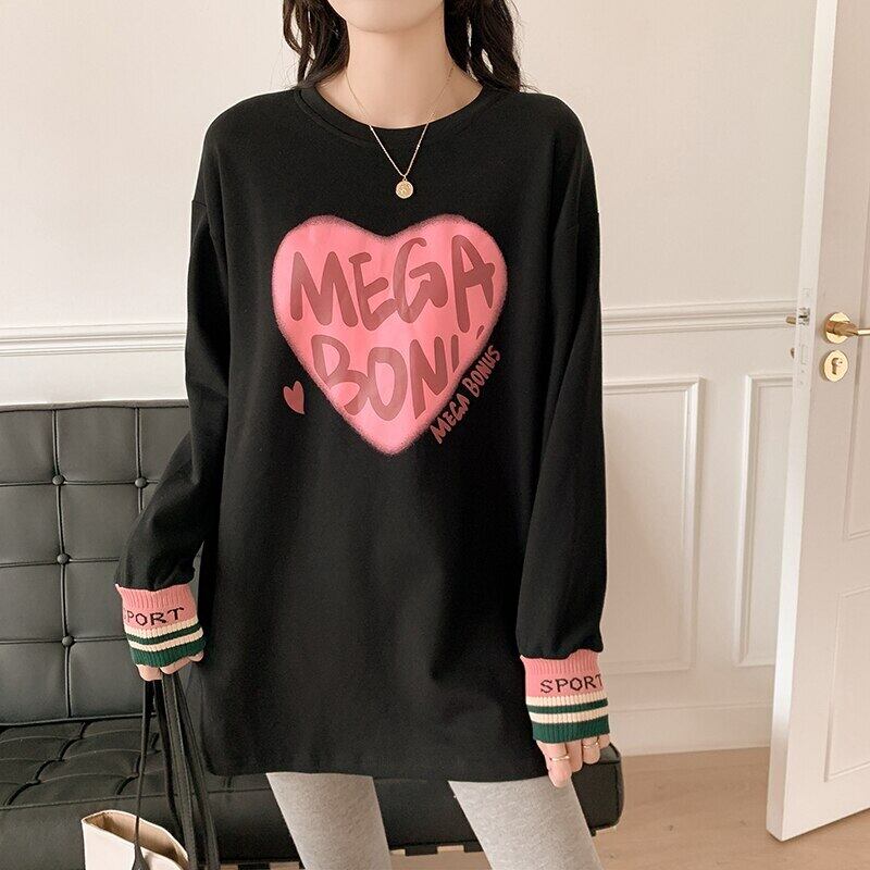 原宿純綿長袖女性 Tシャツ特大レタープリントロング底入れ Tシャツ黒トップスストリート ブラック コットン かわいい ピュア Aim94354619941