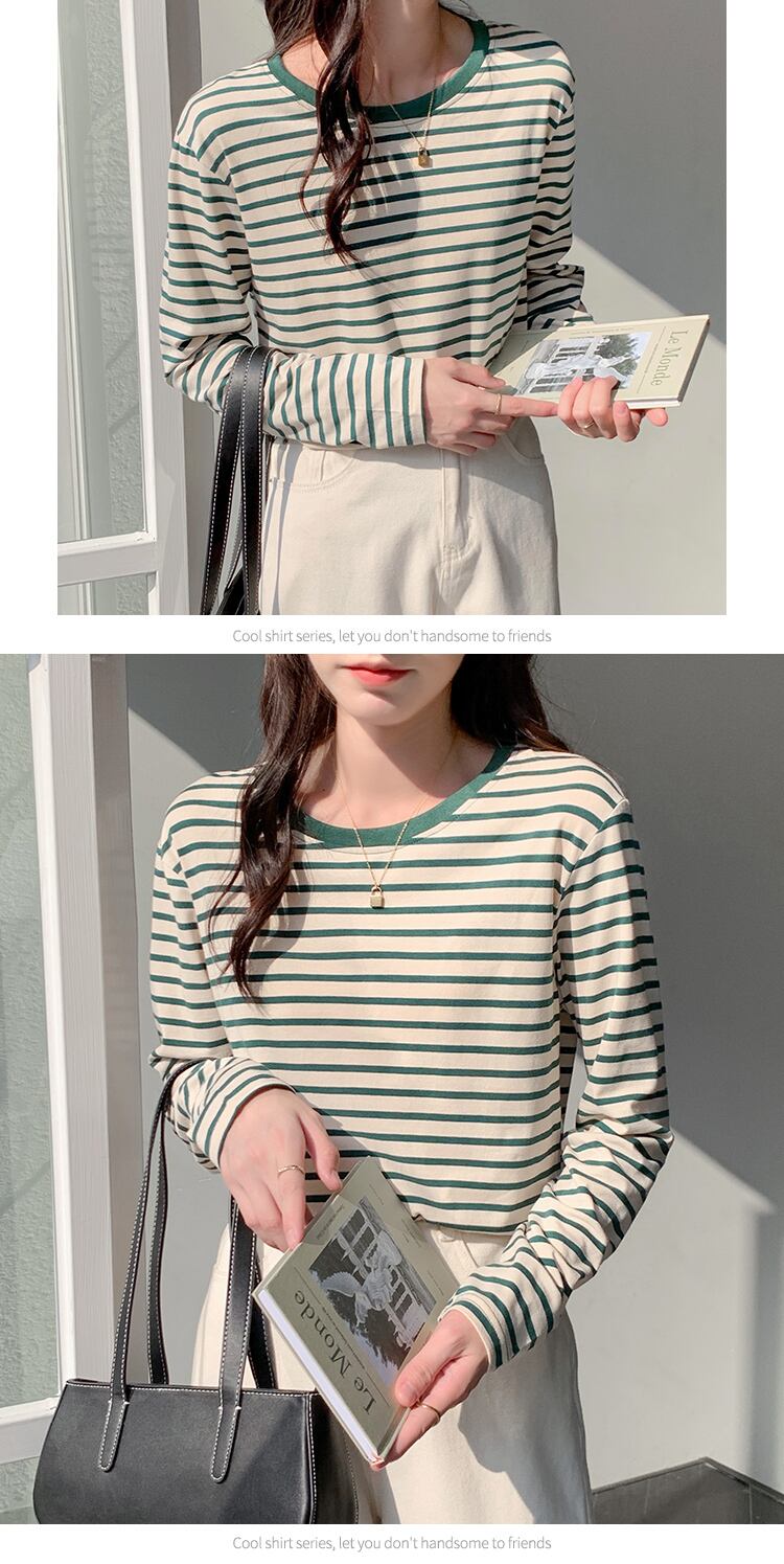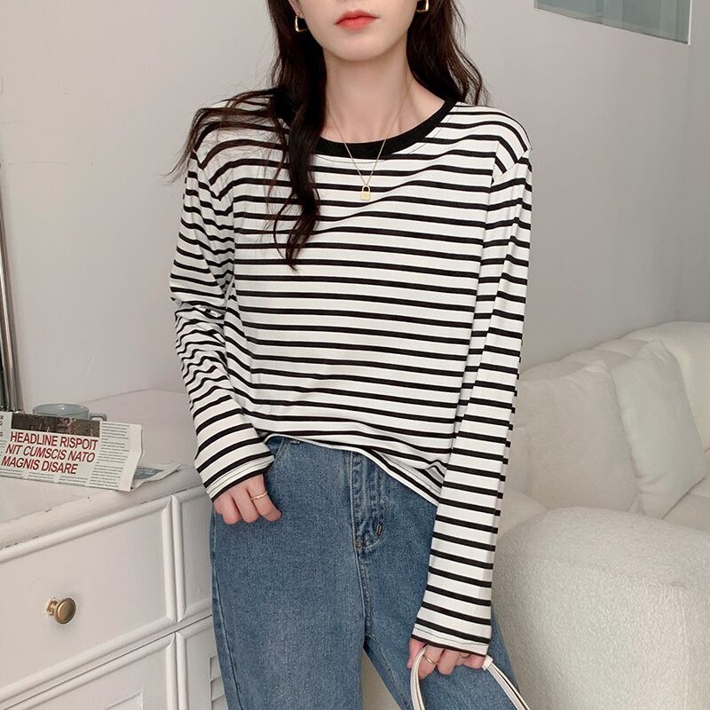 原宿純綿長袖ストライプ Tシャツ女性韓国カジュアルルーズ O ネック底入れ Tシャツ女性オールマッチソフトトップス ロング コットン かわいい Oネック ピュア Aim33785043149