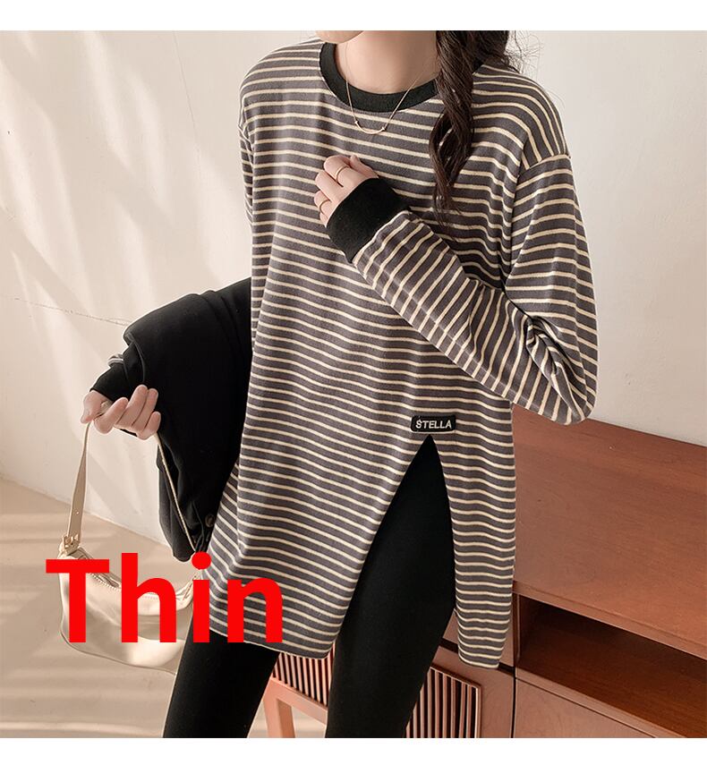 秋冬純綿長袖ストライプ Tシャツ女性韓国フリース暖かいサイドスリット特大底入れ Tシャツトップス ロング コットン オータム 秋物 ウィンター 冬物 ピュア Aim9354868436