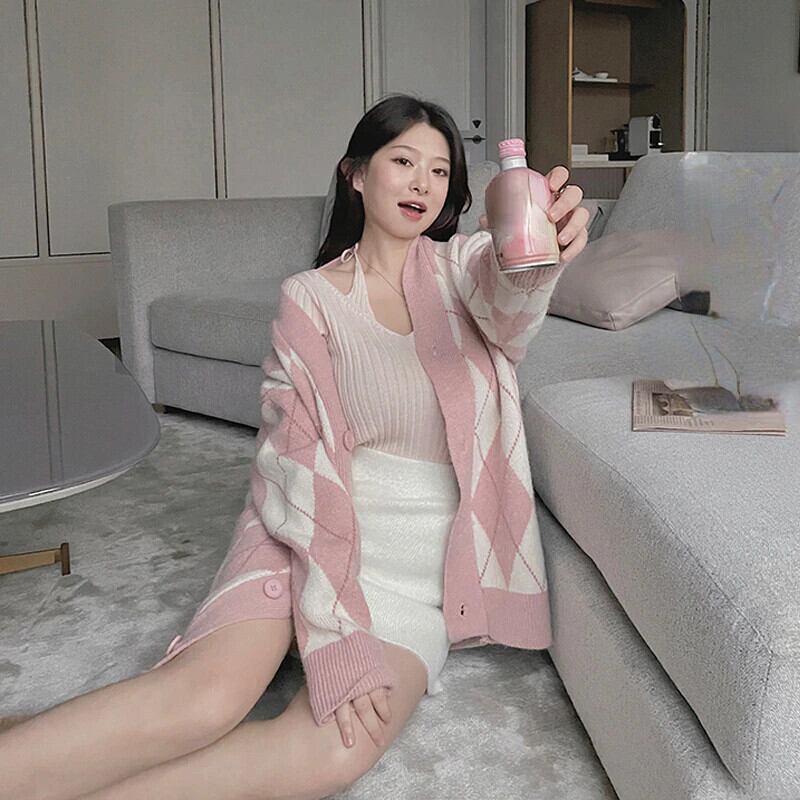 秋アーガイルプリントカーディガン女性ボタン特大ジャケットセータールーズピンク黒厚手ニットカーディガン女性 2022 ブラック オータム 秋物 Aim72891644530