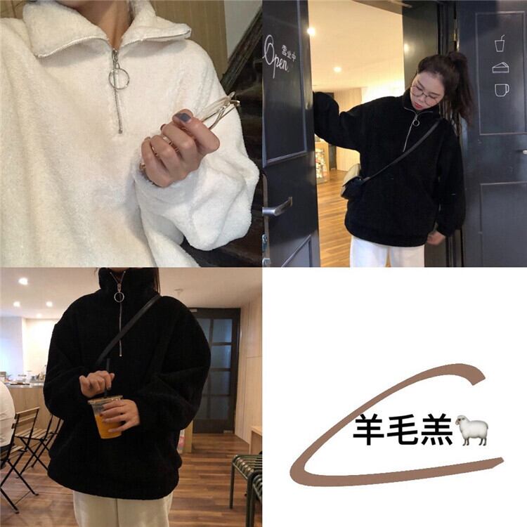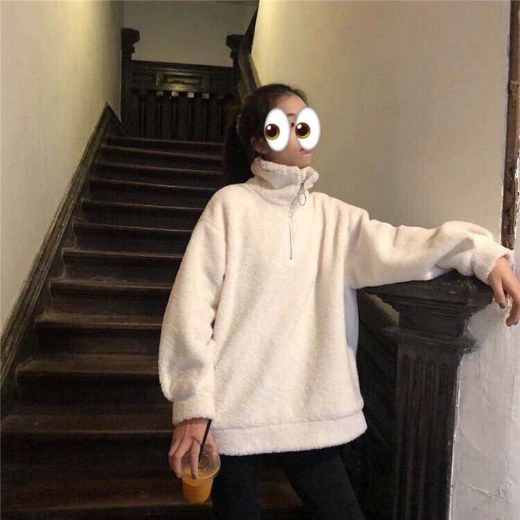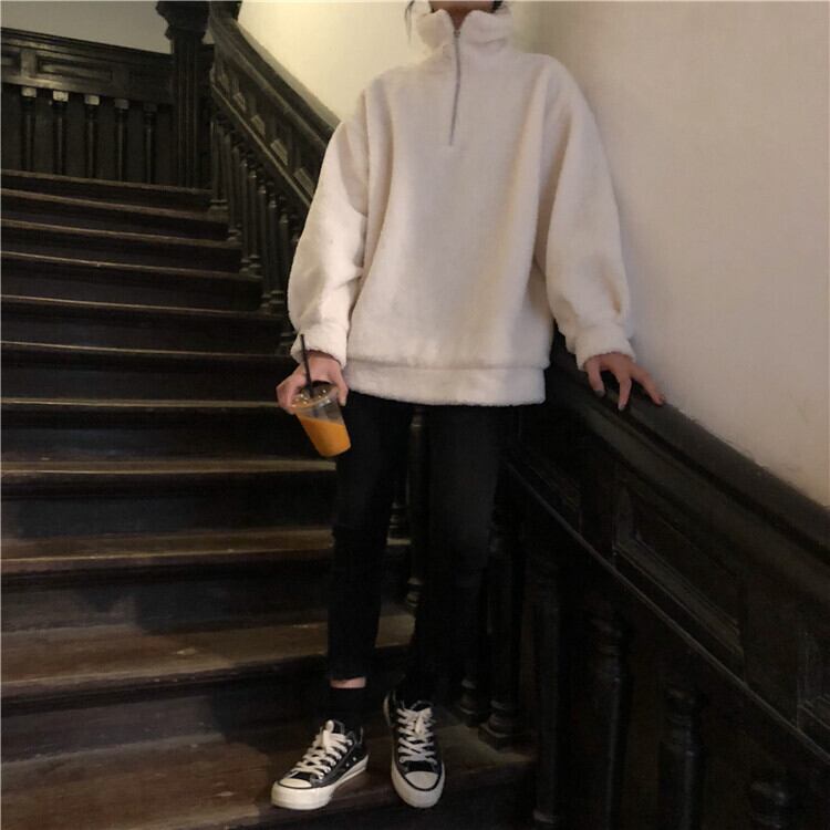 原宿固体タートルネックジッパーパーカー秋冬厚みの子羊フリース特大パーカー女性カジュアルフルスリーブスウェット シャツ かわいい オータム 秋物 ウィンター 冬物 ソリッドカラー Aim85100776444