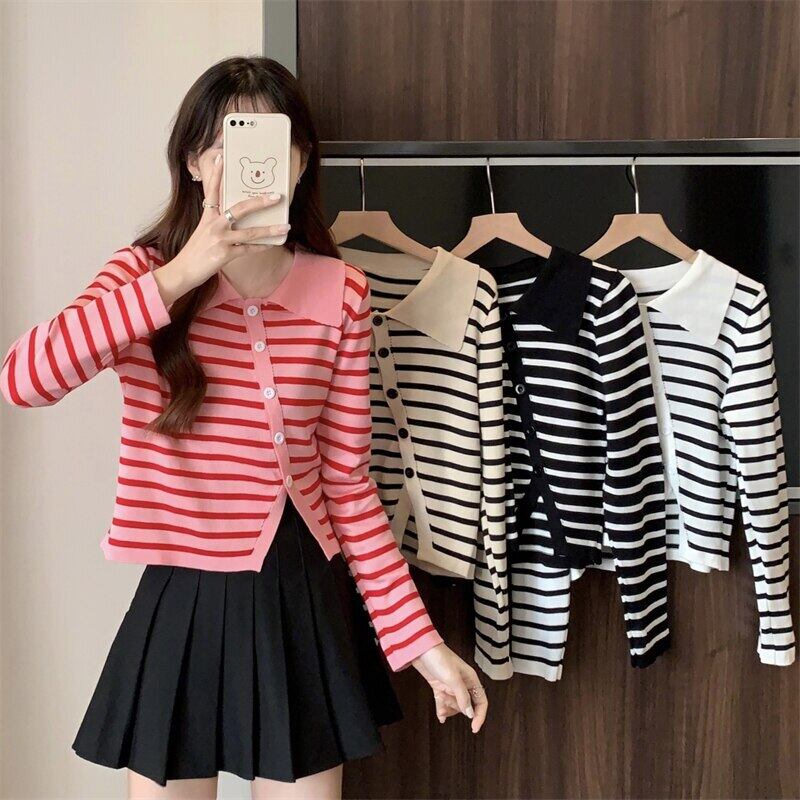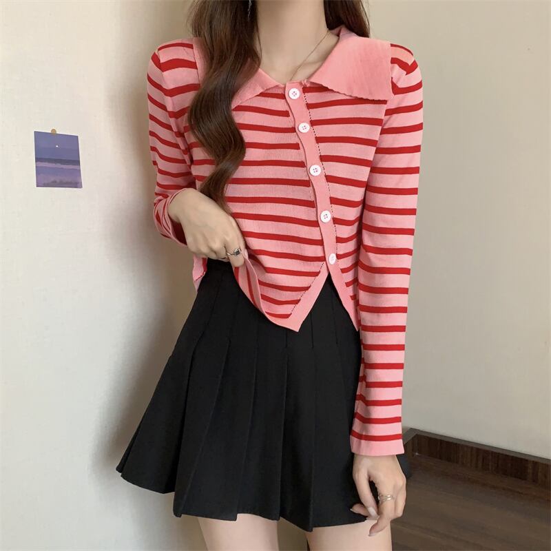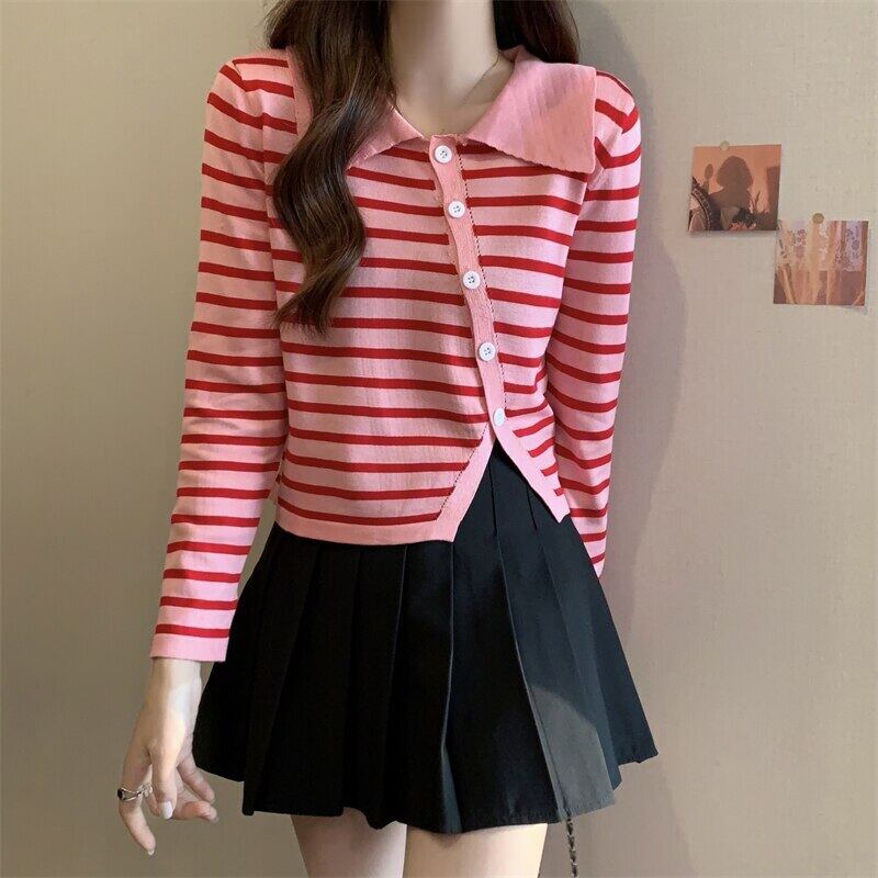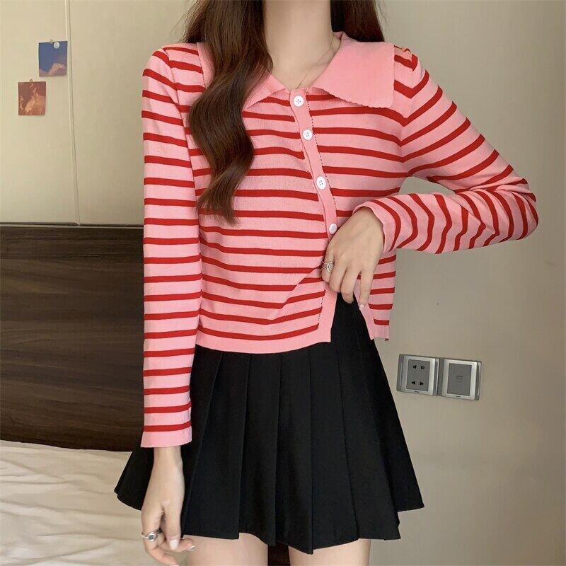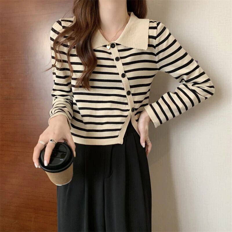 秋スリム ニット セーター プルオーバー オールマッチ ボタン長袖ストライプ セーター T シャツ ジャンパー クロップ トップ свитер женский ロング オータム 秋物 Tシャツ Aim88096404806