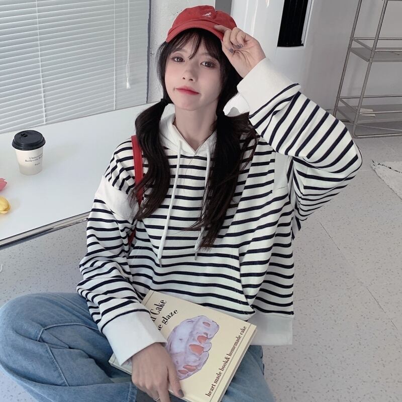パーカー女 ショート ホワイト コットン シャツ かわいい ストライプ Aim17337385972