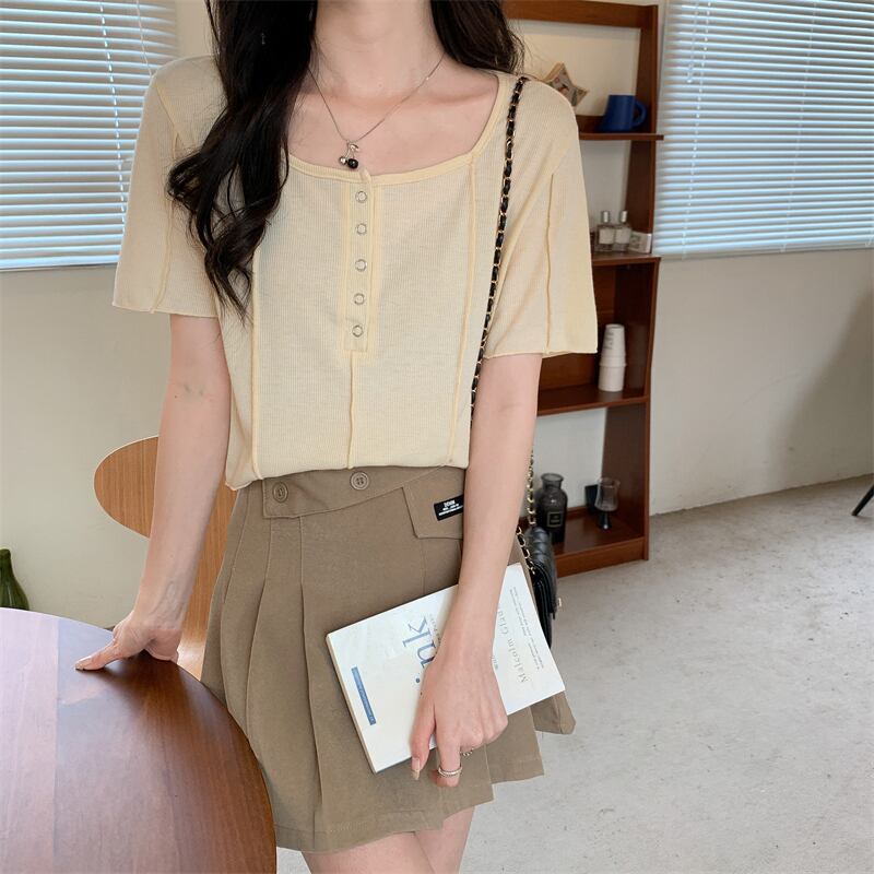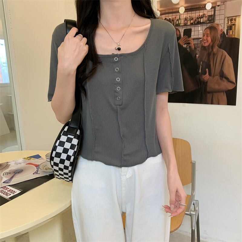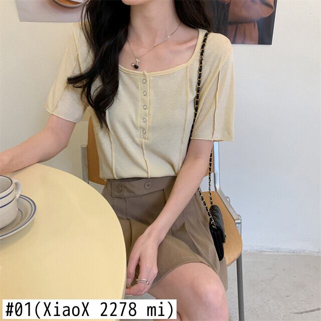 原宿 4 色スウィート少女ベージュ Tシャツ女性の夏の半袖 Tシャツボタンクロップトップ M-XL ショート ハーフスリーブ 大人ガーリー キュート カジュアル かわいい サマー 夏物 Aim65029507157