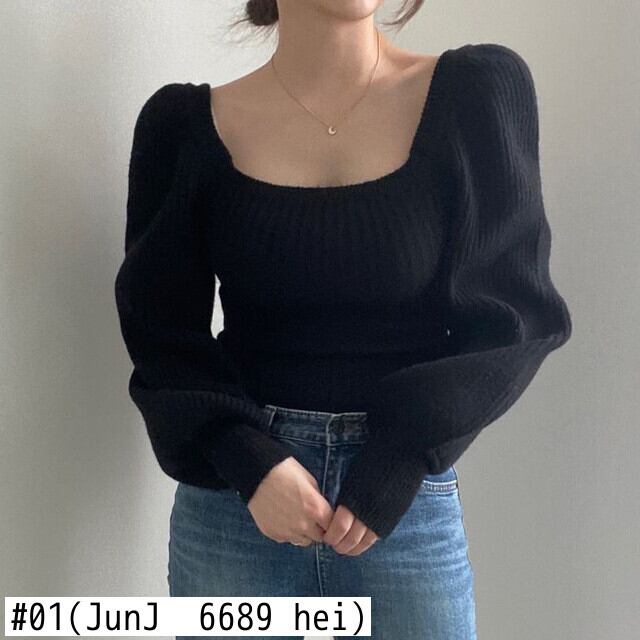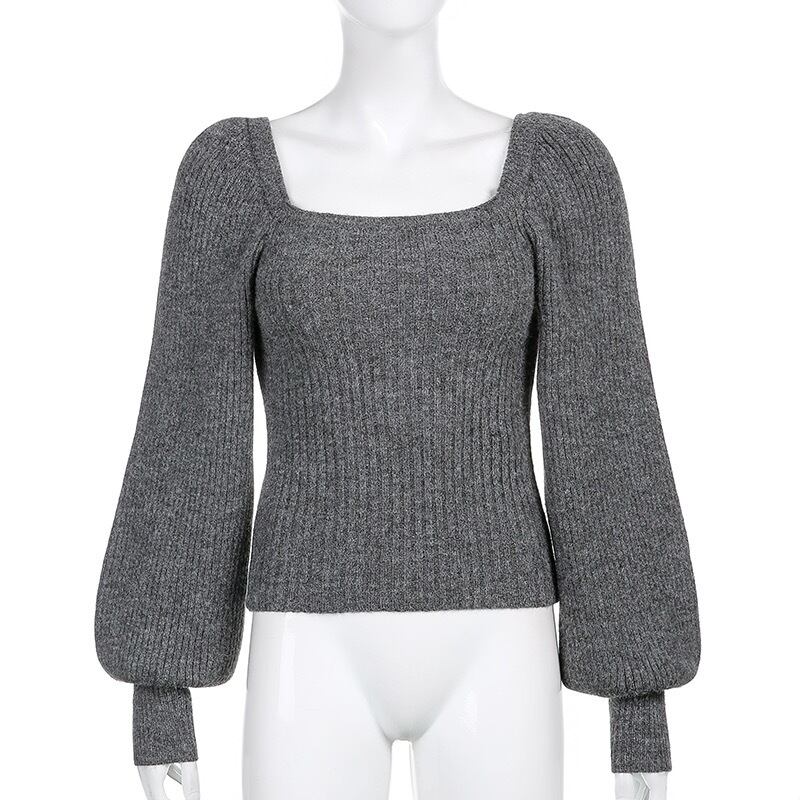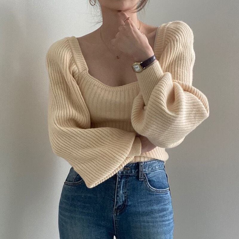 原宿ランタンスリーブニットセーター女性スクエアカラー固体プルオーバーセクシーなセーター Y2k トップス女性 かわいい ソリッドカラー スクウェア Aim28999183495