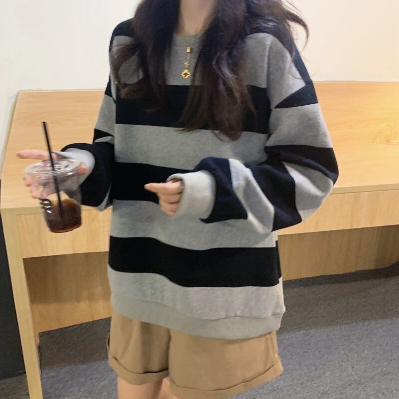 女性トレーナー原宿ストライプ薄手のコットン特大パーカーストリートグレー長袖パーカープルオーバー ロング かわいい Aim41594754894