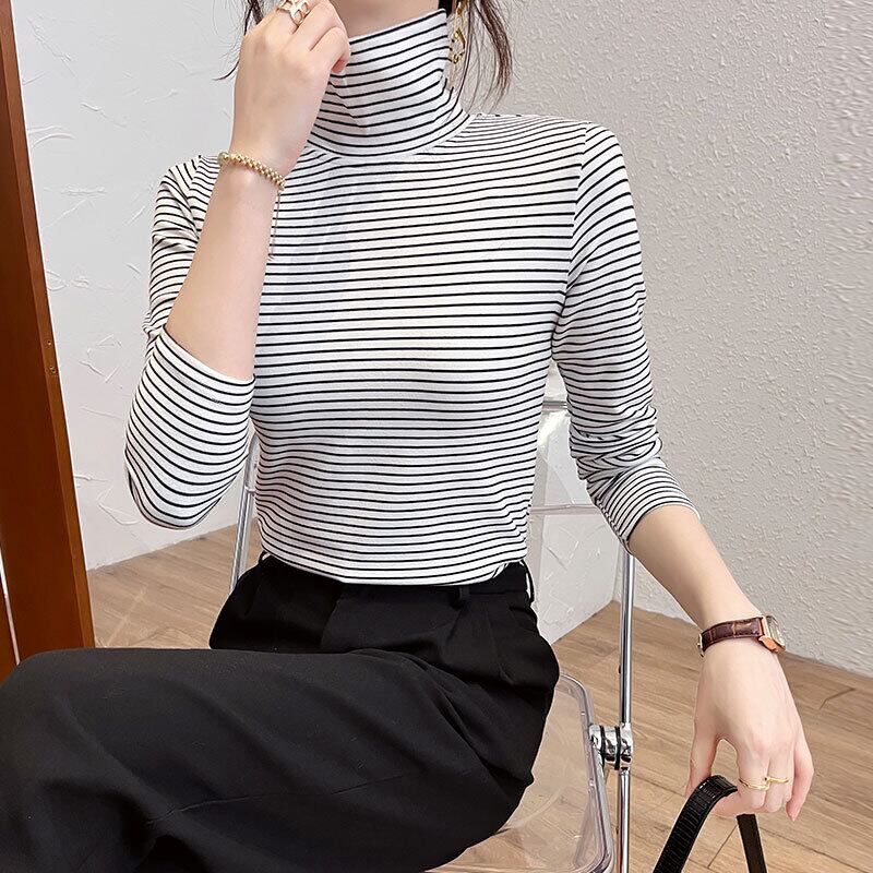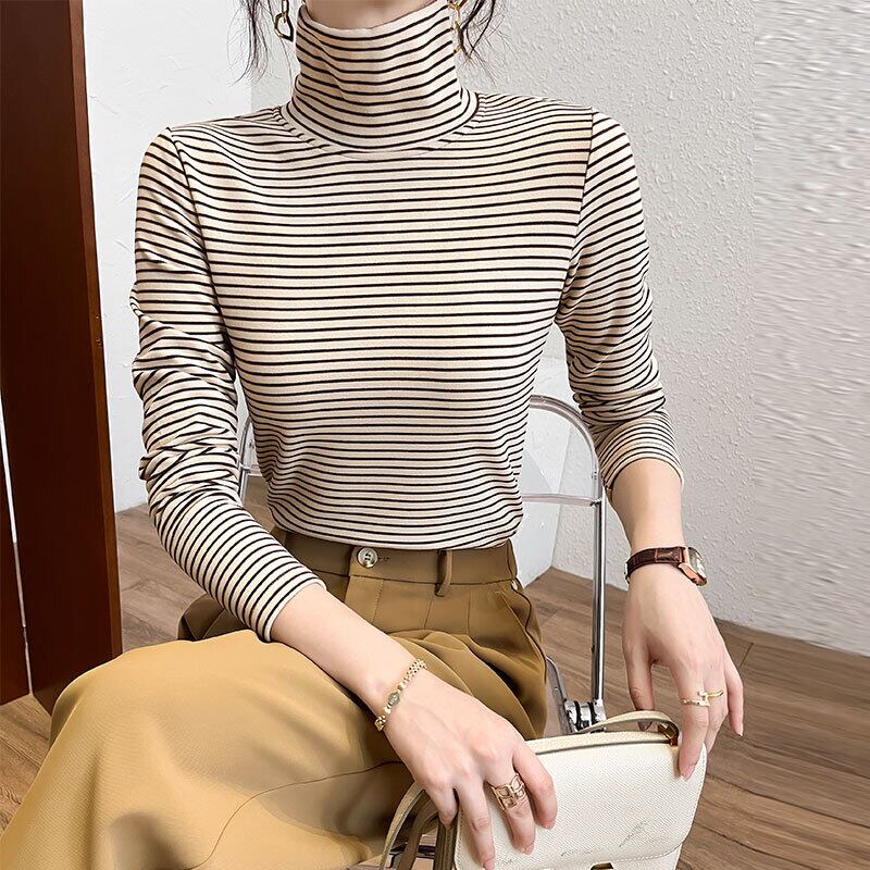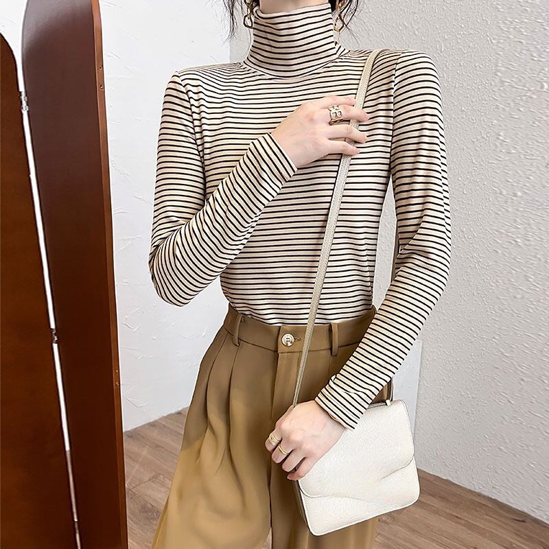 韓国長袖タートルネックスリム底入れ Tシャツ秋冬ベルベットストライプ女性 Tシャツ厚く暖かいオールマッチトップス ロング オータム 秋物 ウィンター 冬物 Aim59874238674