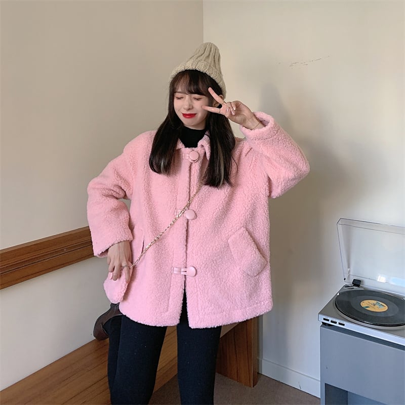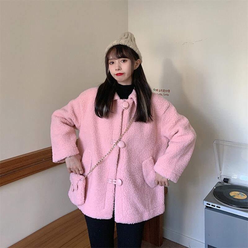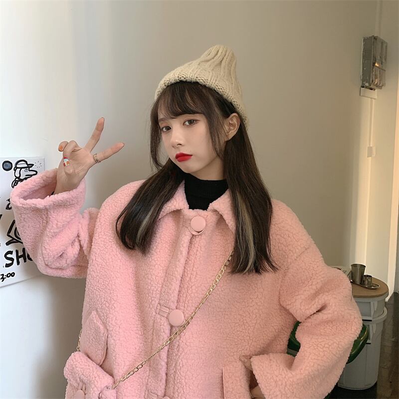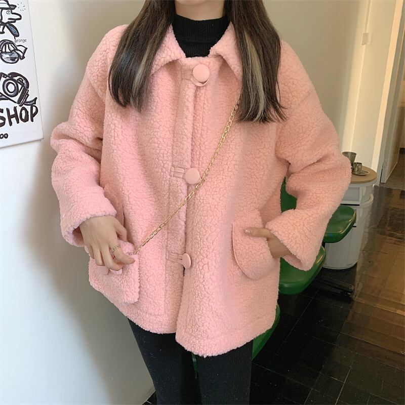 冬服女性子羊ウールコートジャケット暖かいピンクのフリースジャケット豪華なオーバーコートポケット生き抜くかわいい厚くコート 大人ガーリー ウィンター 冬物 Aim67950015726
