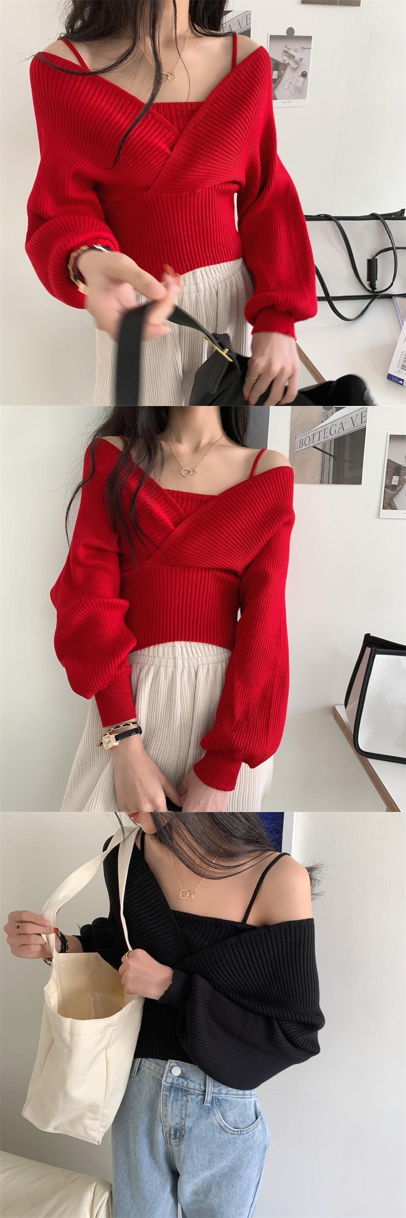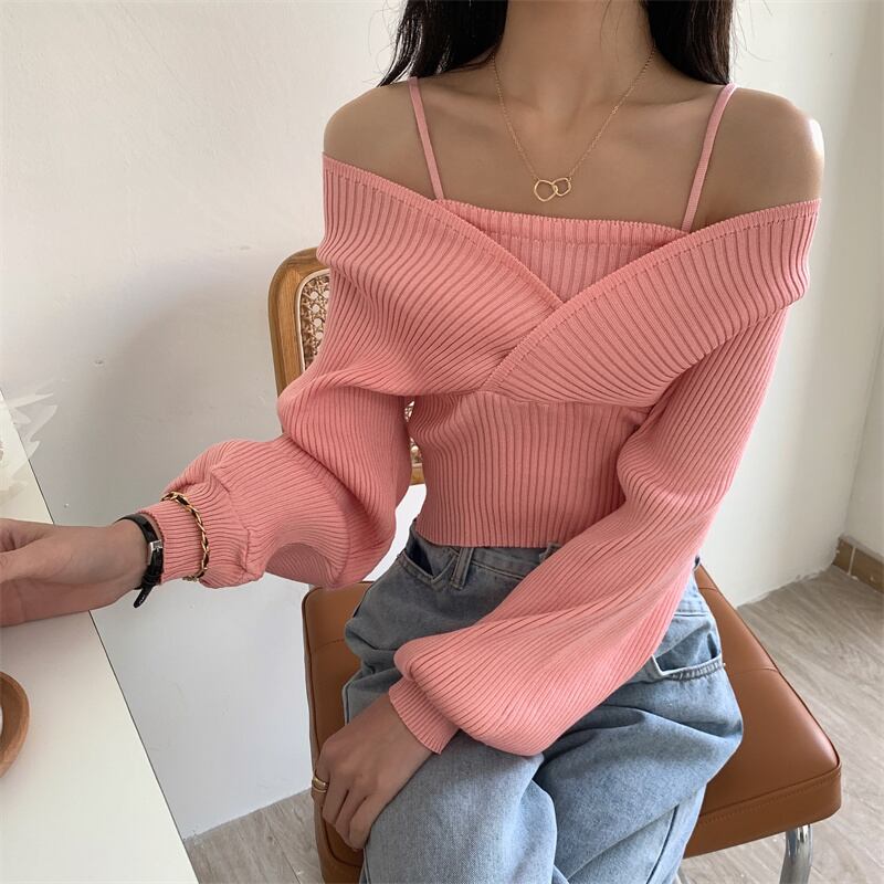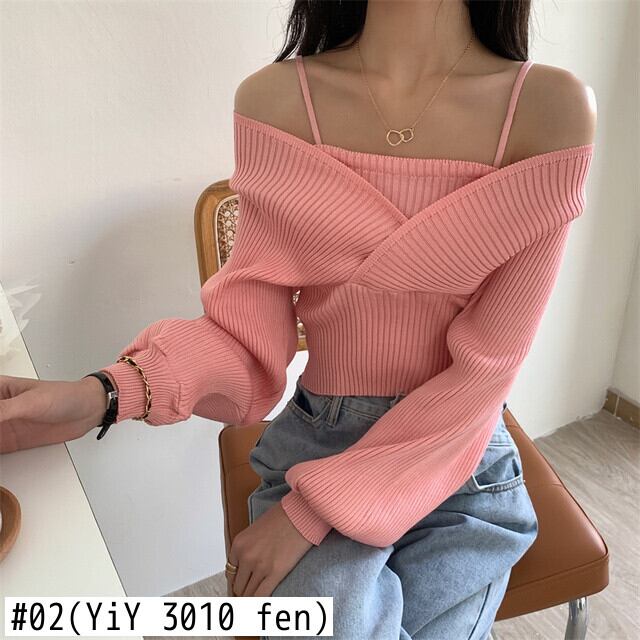秋フェイク 2 セーター女性バットウィング V ネック長袖固体セクシーなニットセーターショートシックな野生プルオーバー ロング オータム 秋物 Vネック ソリッドカラー Aim64051907851